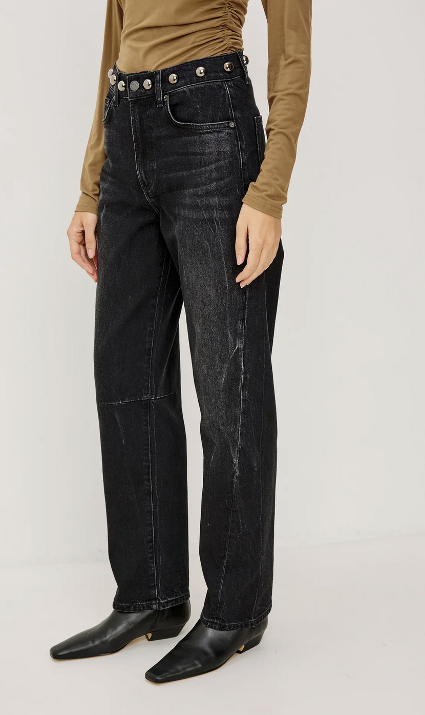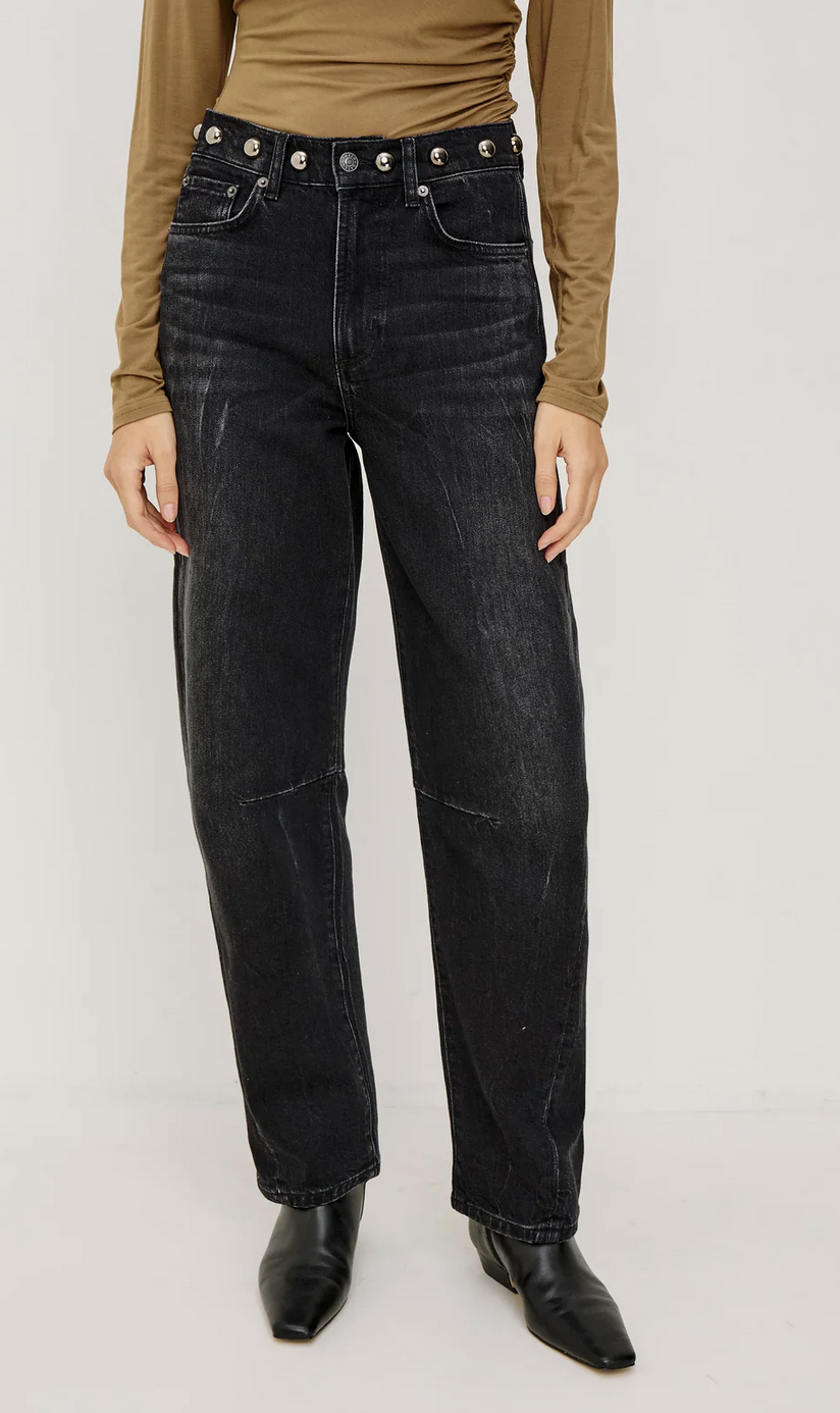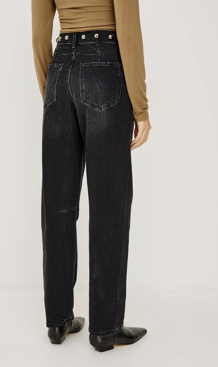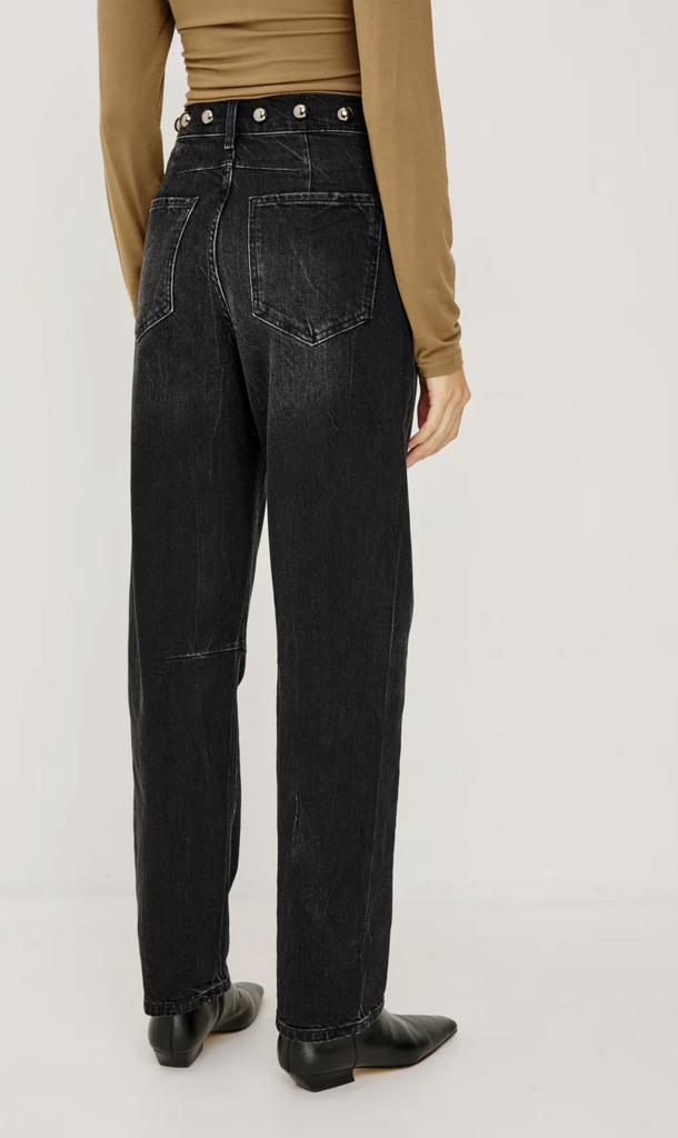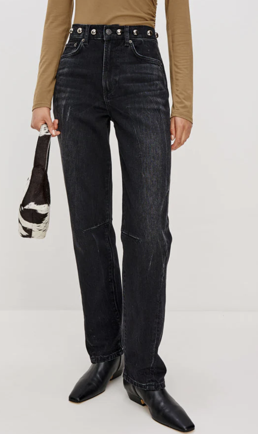 Metallic nail-back studs accent the waistline, lending the style a quietly confident sophistication, while a sleek zip-fly closure ensures seamless wear.