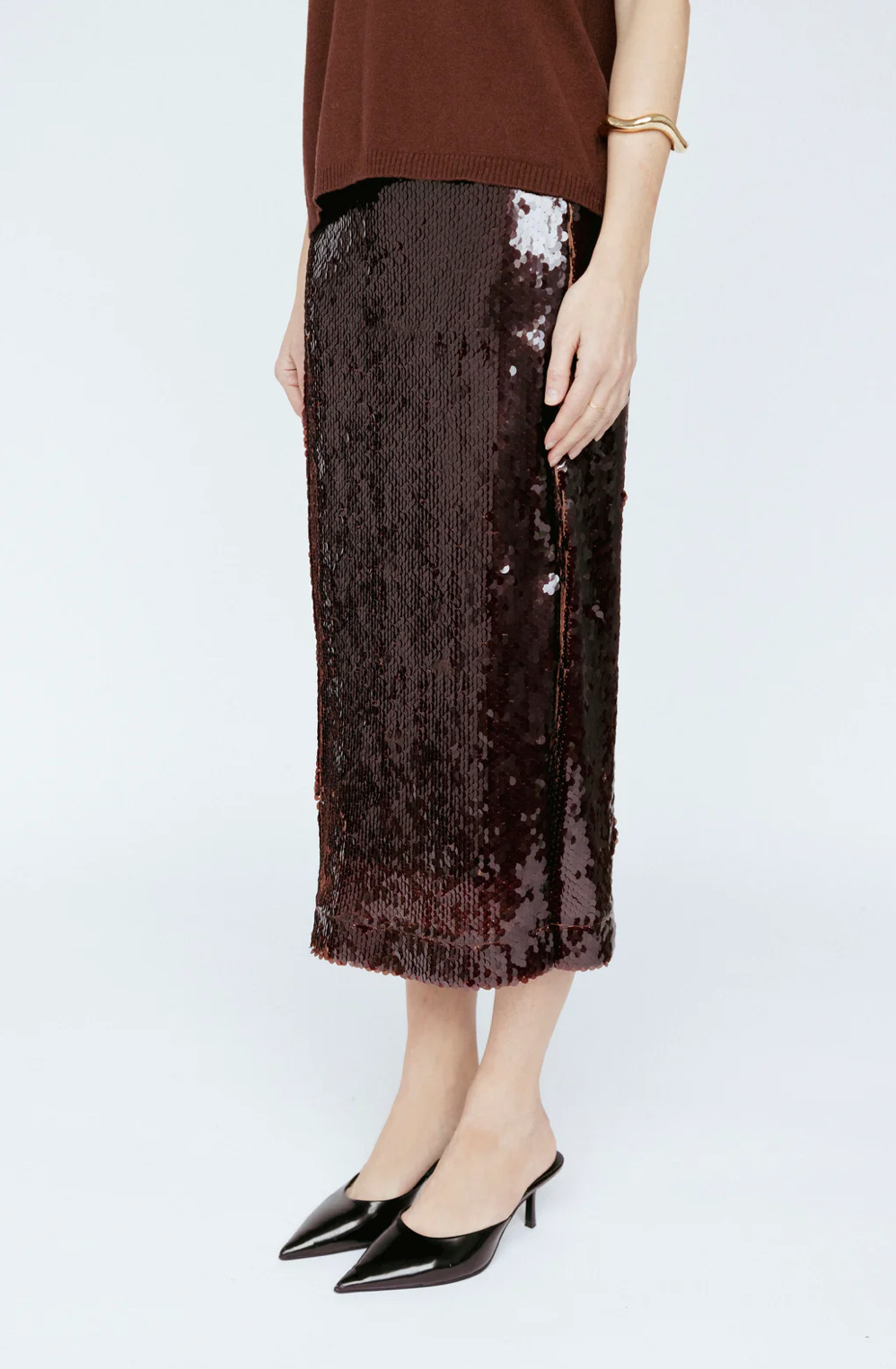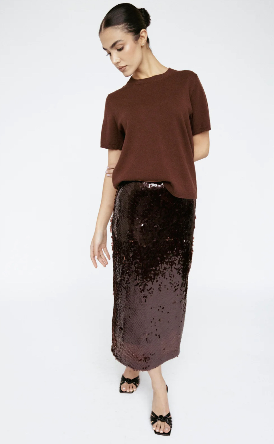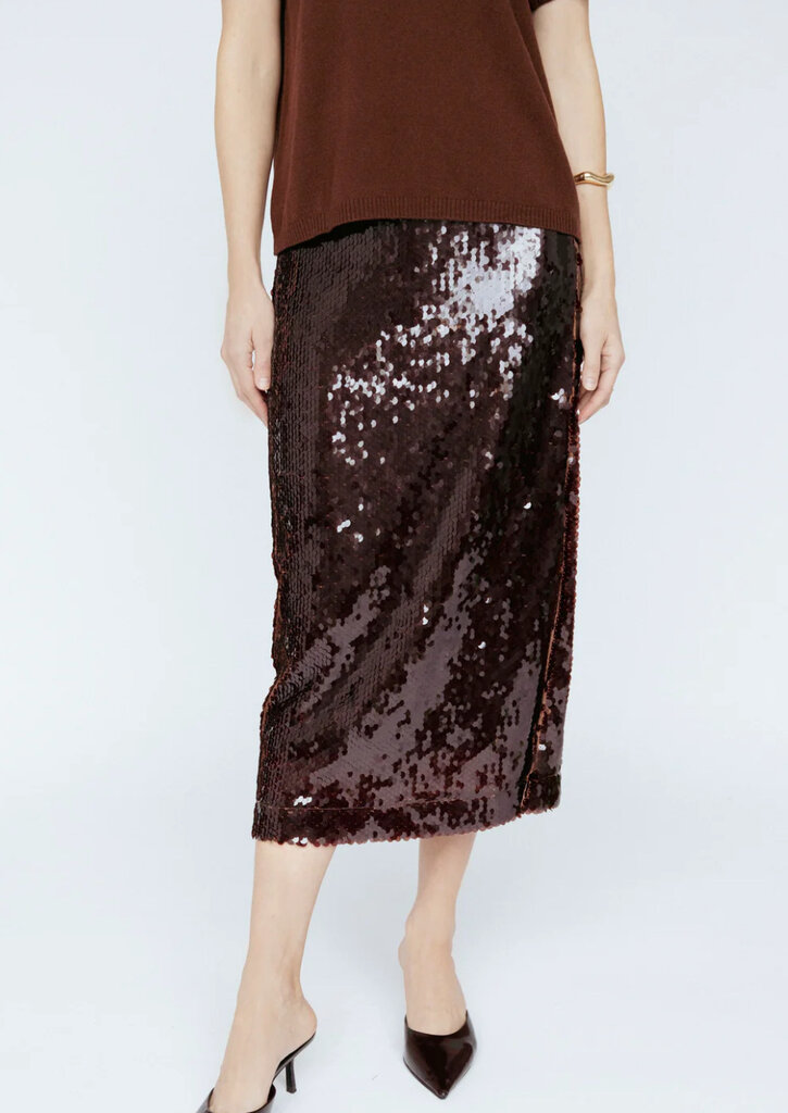 Designed to captivate, this sequin skirt shimmers in a deep mahogany brown, offering a rich and refined take on evening glamour. Cut to a flattering midi length with a straight silhouette, it’s finished with a side slit for subtle movement. An elastic waistband and slinky stretch jersey lining ensure ease and comfort without compromising its elevated allure.