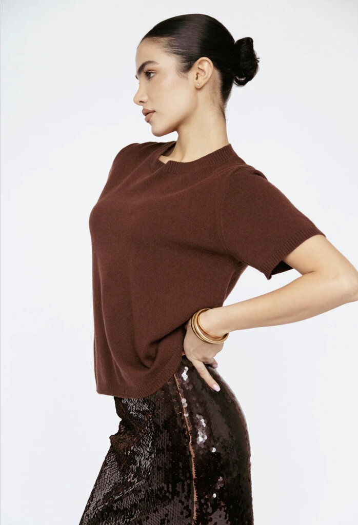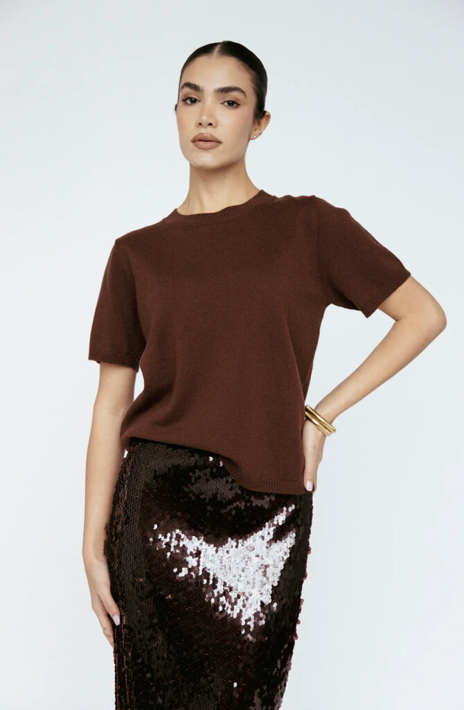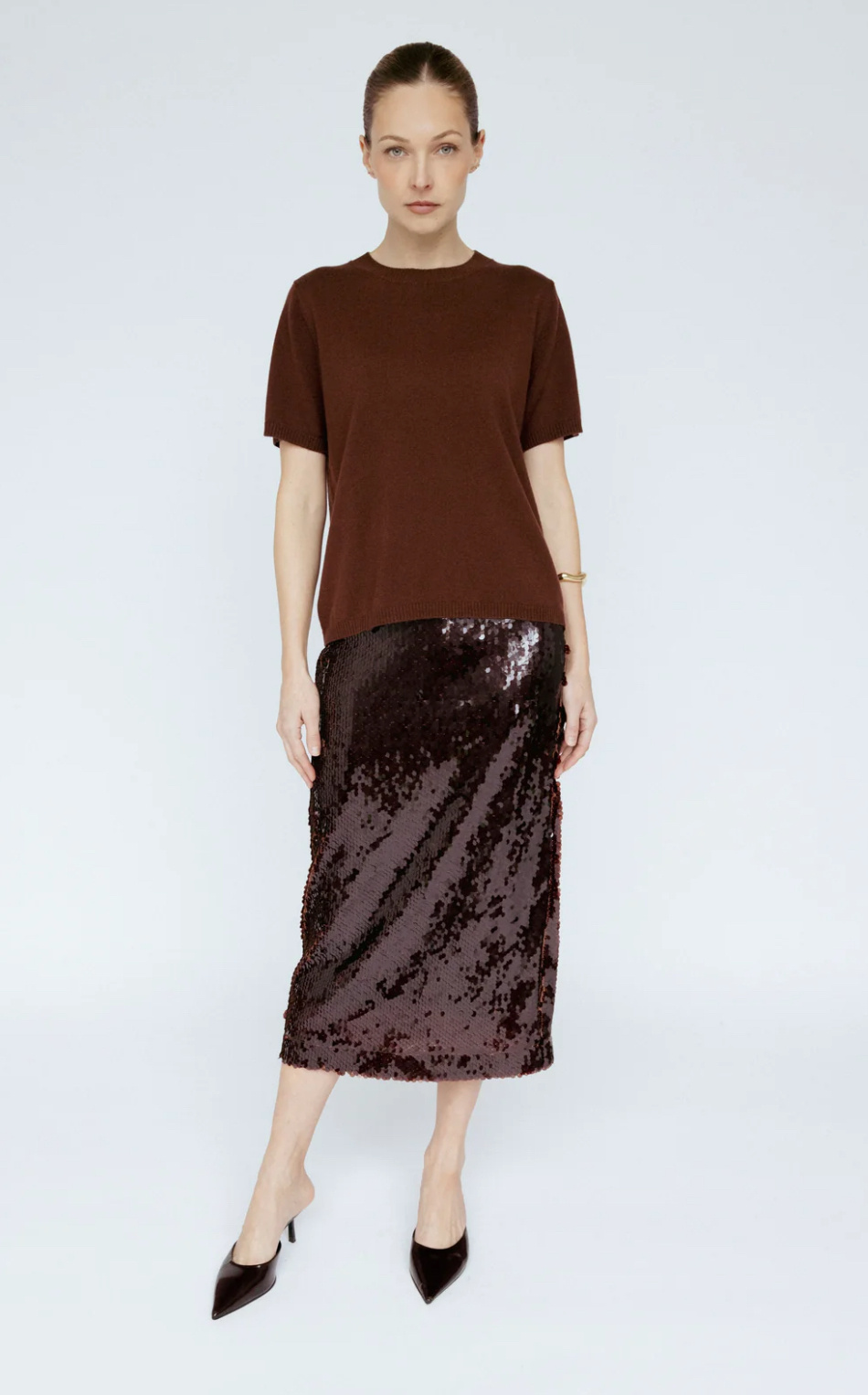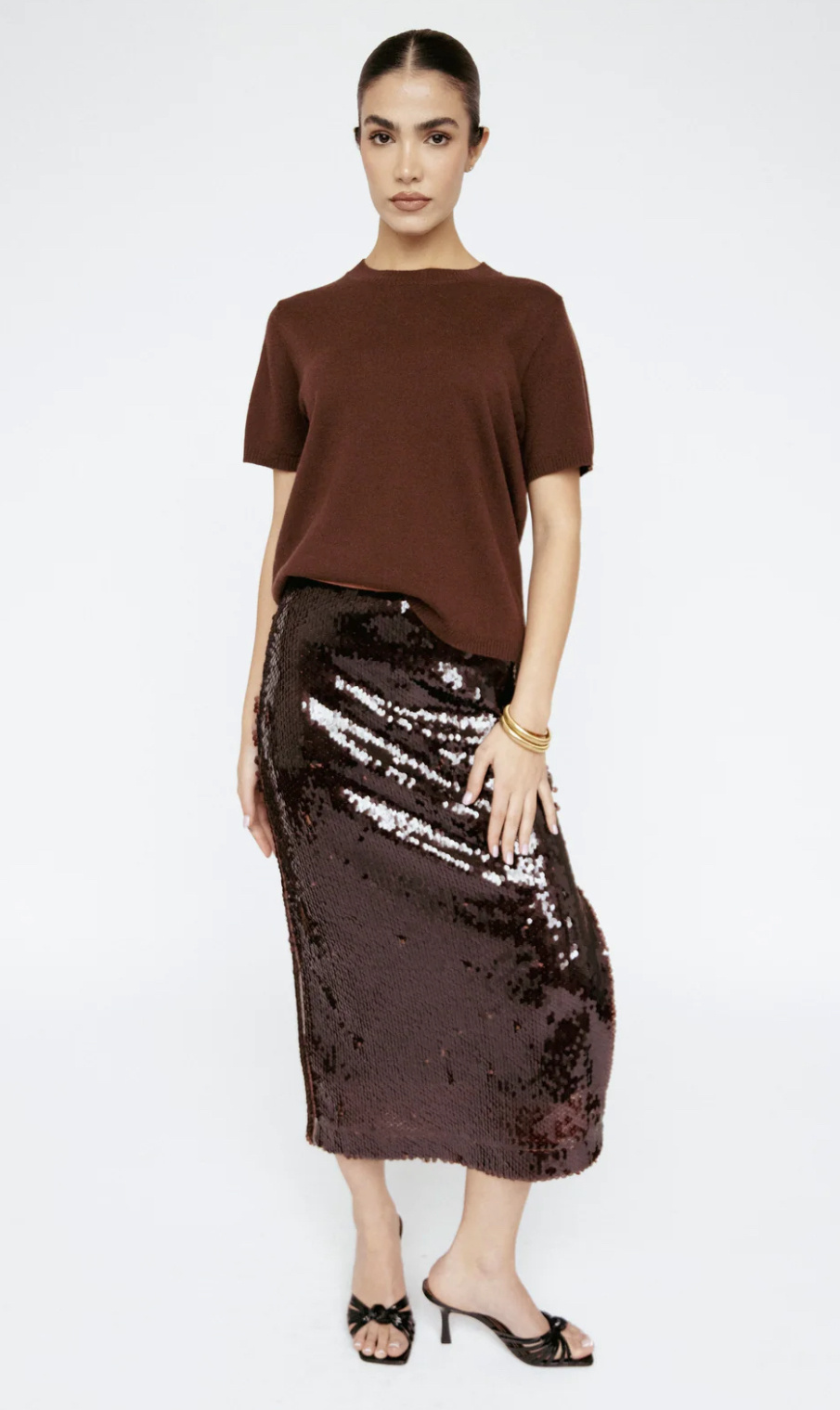 Designed to captivate, this sequin skirt shimmers in a deep mahogany brown, offering a rich and refined take on evening glamour. Cut to a flattering midi length with a straight silhouette, it’s finished with a side slit for subtle movement. An elastic waistband and slinky stretch jersey lining ensure ease and comfort without compromising its elevated allure.