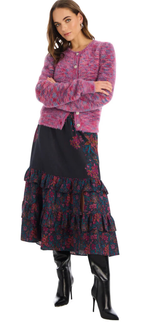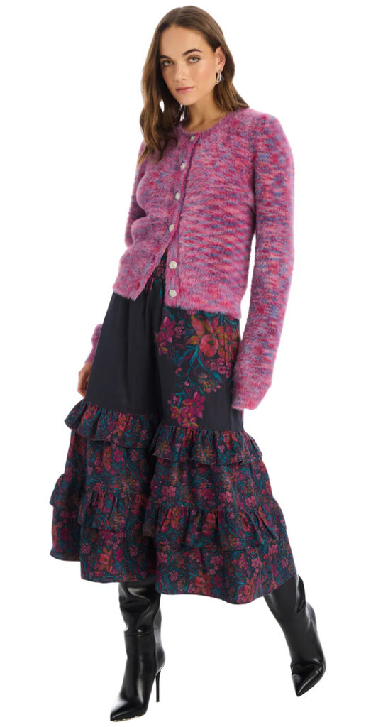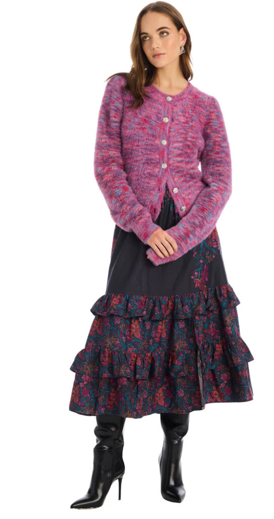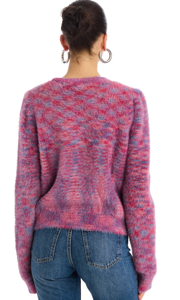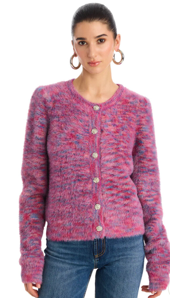 The Sloan Cardigan is designed in a super soft fuzzy knit with pink and blue hued space-dye yarns. Add a touch of feminine style: featuring silver floral buttons at the center front opening.