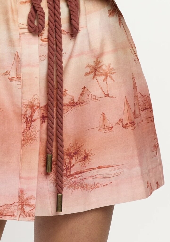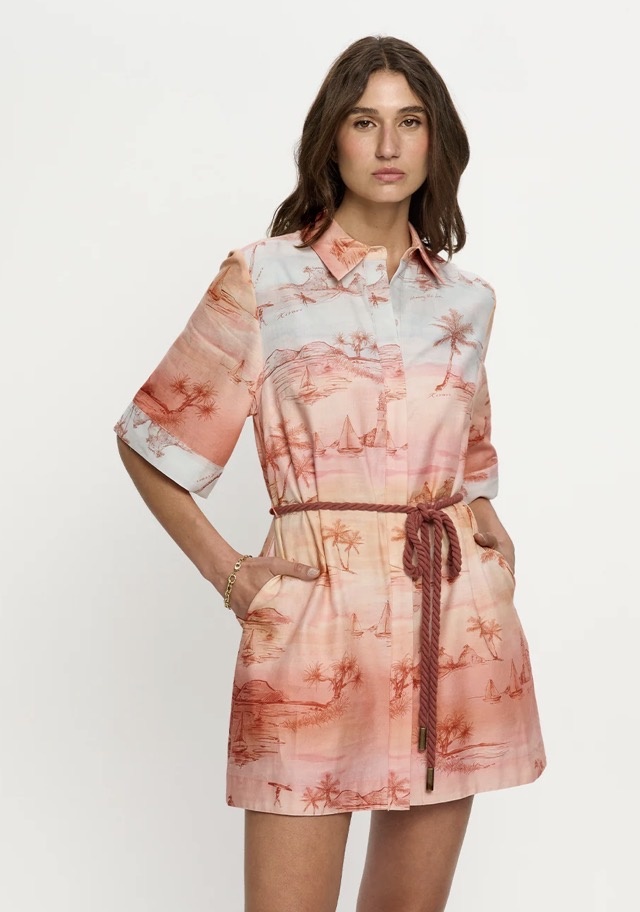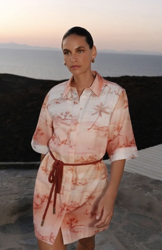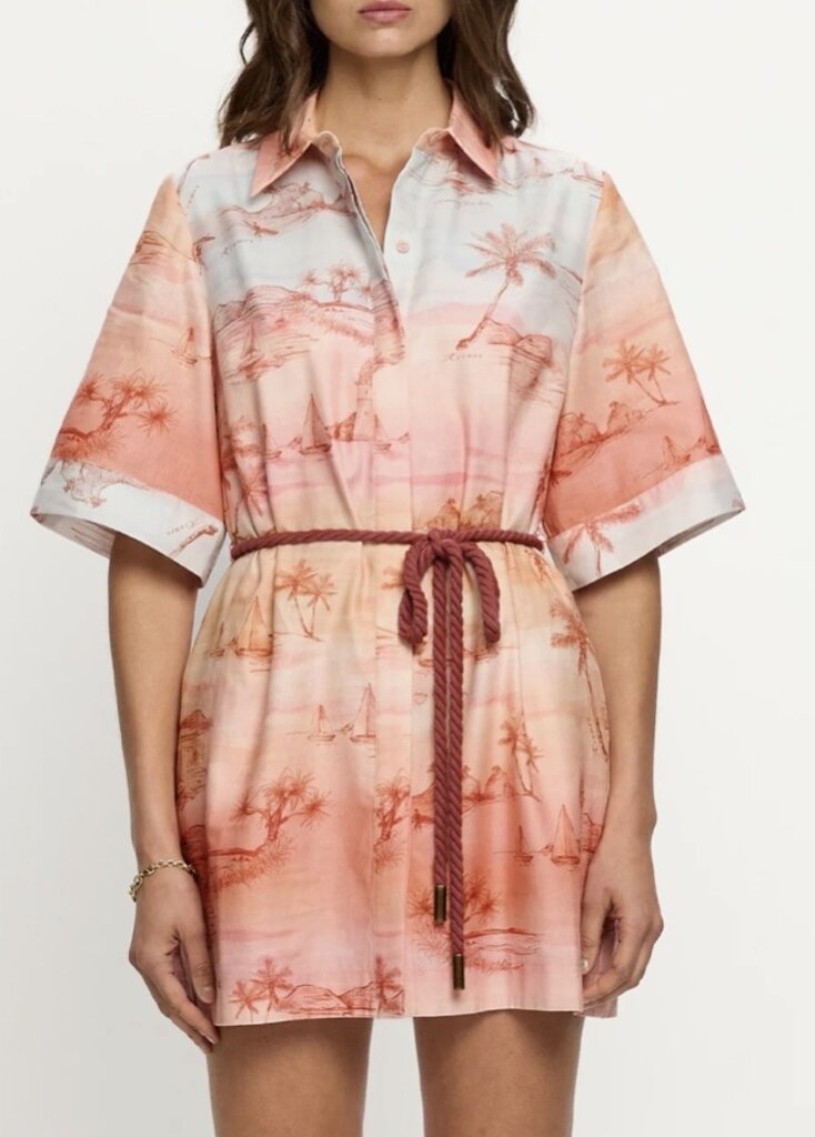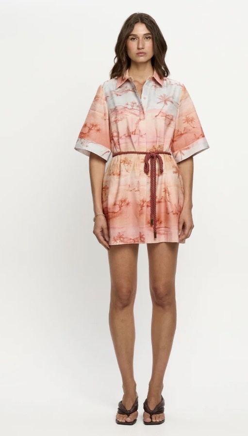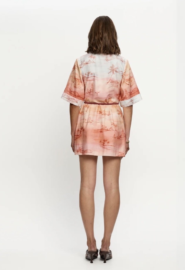 The Sunset Mini Dress is a relaxed silhouette featuring kimono-style sleeves, a classic collar and a button-through front, complete with a removable waist tie for versatile styling. Style with sandals for sun-soaked weekends and long lunches.