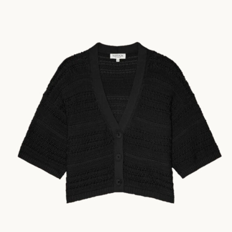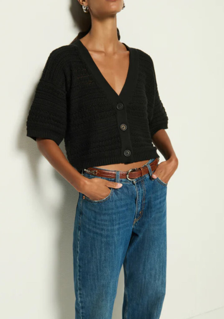 Designed with utmost versatility in mind, the Tabby Crochet Cardi is your layerable essential of the season. Knit in a crocheted Pima Cotton, this sweater showcases a three quarter sleeve, boxy cropped fit, and v-neckline with front button closure.