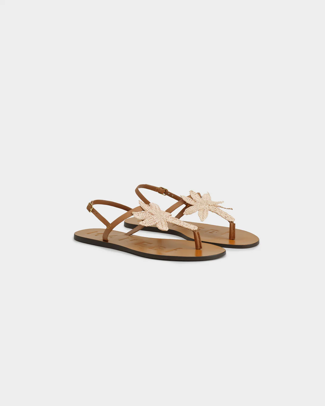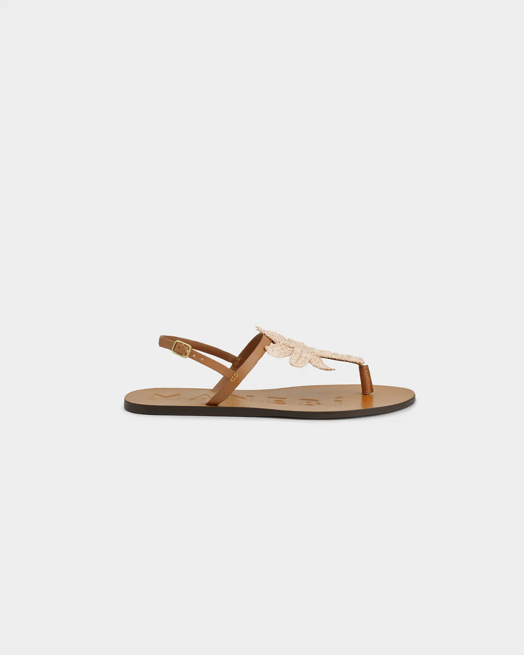 Thong sandal embellished with a hand-woven palm detail in écru, showcasing Manebí’s signature craftsmanship. The smooth leather straps and regenerated leather sole create a clean and sophisticated aesthetic, while the three-dimensional palm adds a distinctive, feminine touch. The adjustable ankle strap ensures a secure and comfortable fit, making it ideal to complete refined summer looks.