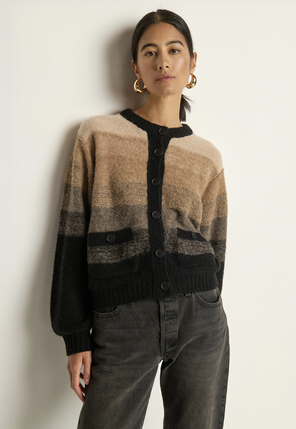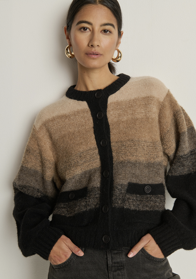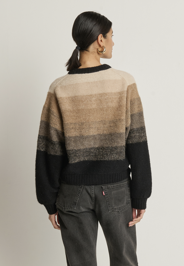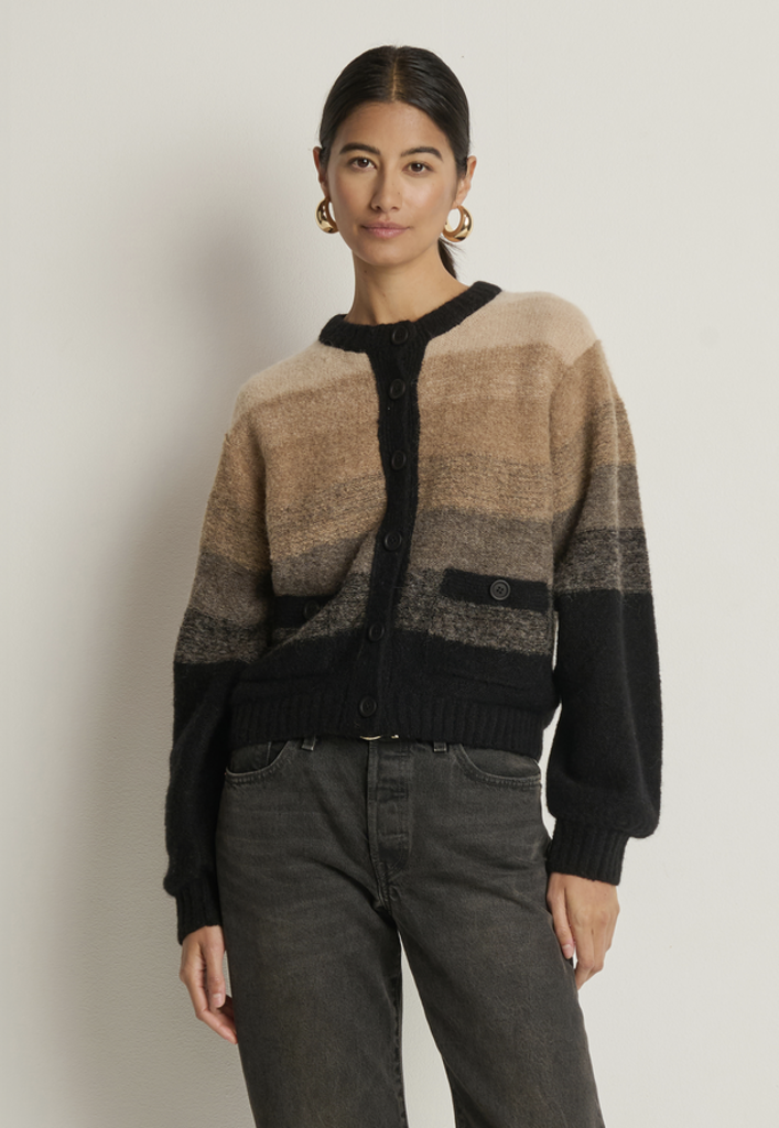 The Tessa Ombre Cardigan wraps you in luxe warmth with a relaxed silhouette—crafted from alpaca and merino wool for soft texture and effortless layering. A crew neck and bishop sleeves balance comfort and style, while the ombre effect adds subtle depth to this timeless piece.