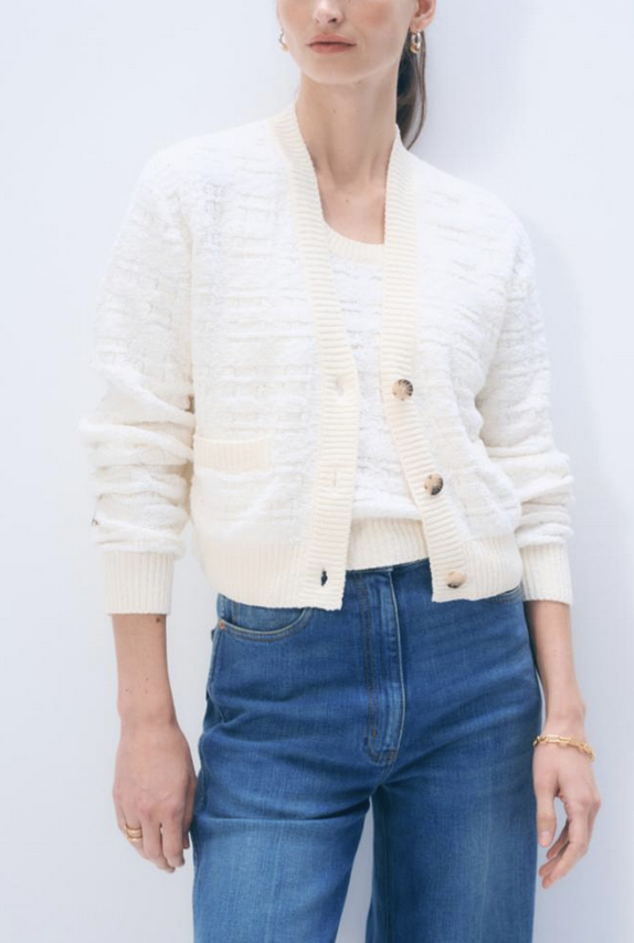The Textured Bouvle Cardigan is a softly structured knit with rich texture and ean easy, relaxed fit. Crafted for effortless layering, this cozy boucle cardigan adds dimension and polish to everyday spring styling.