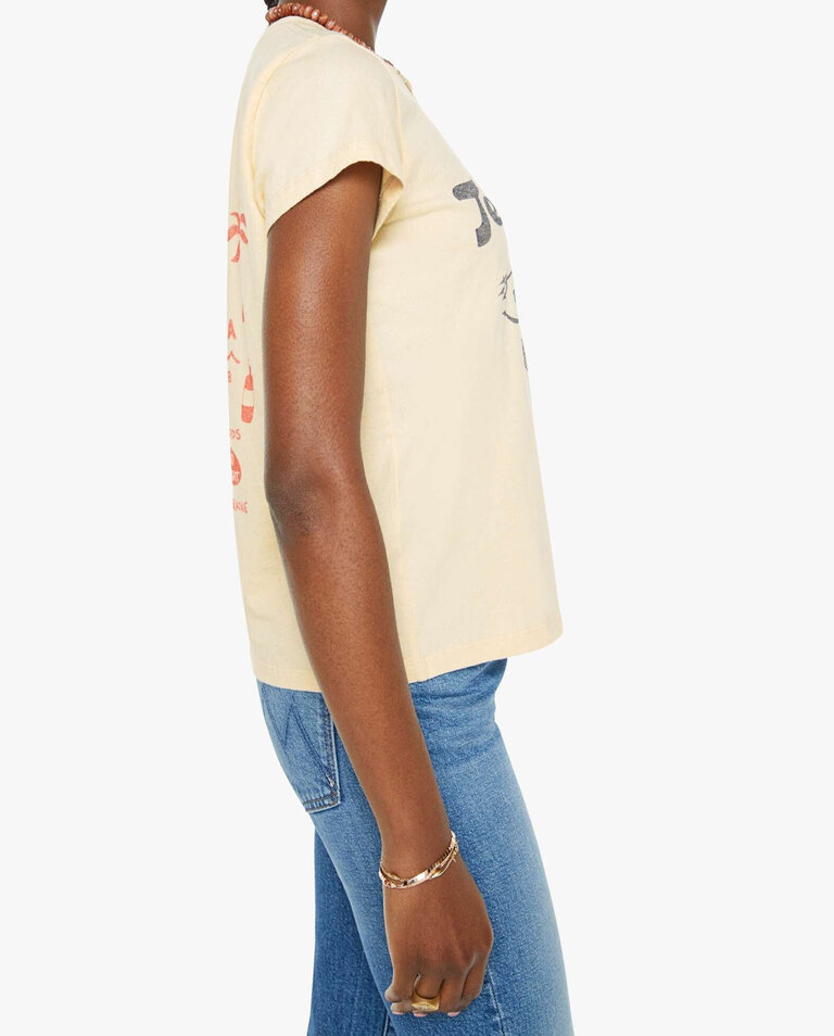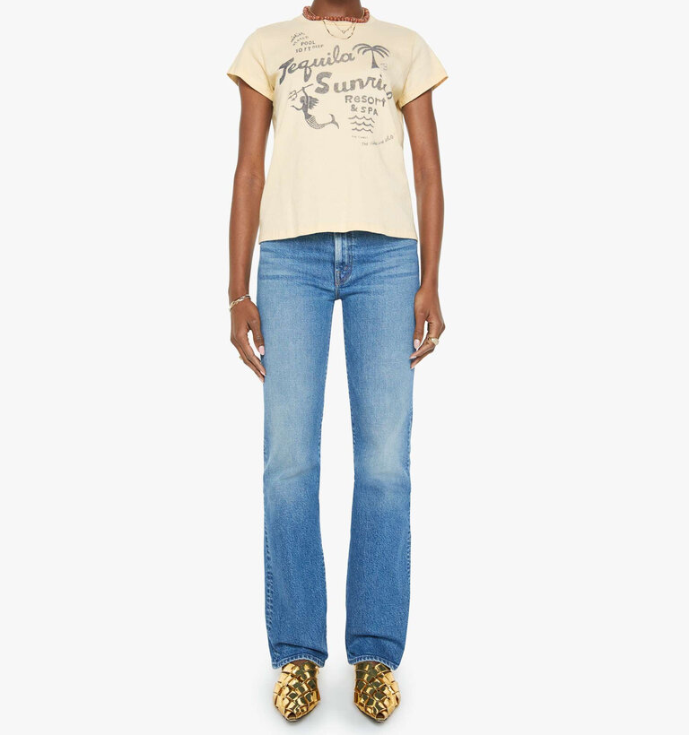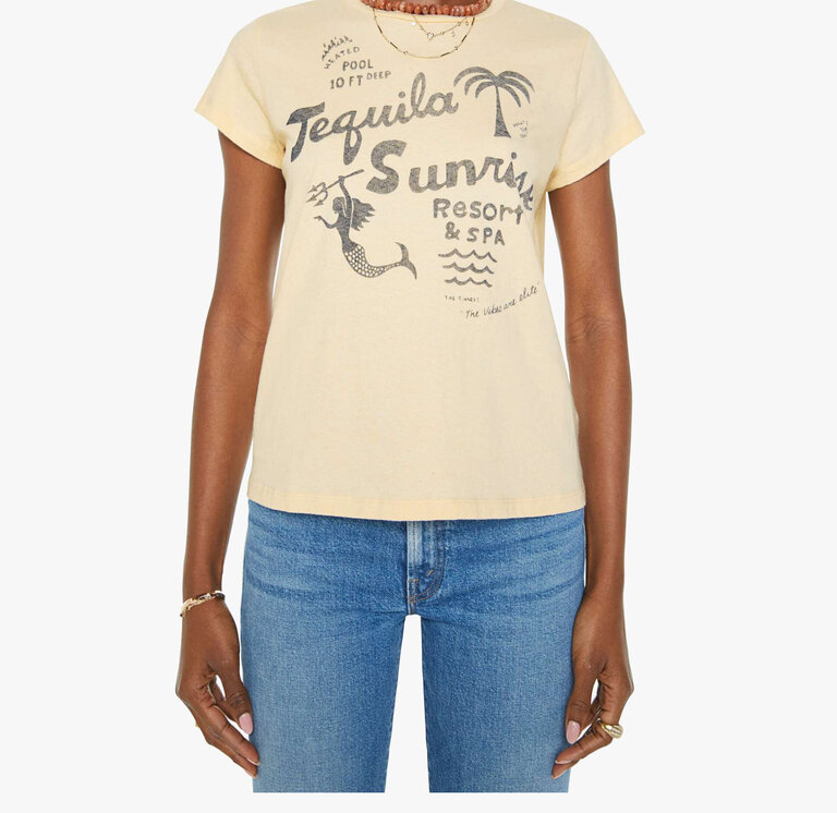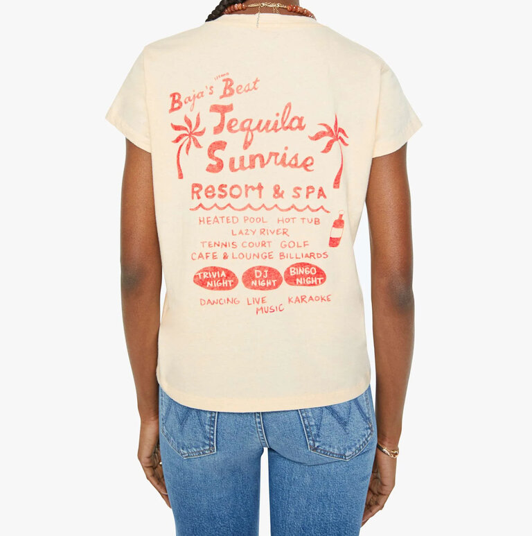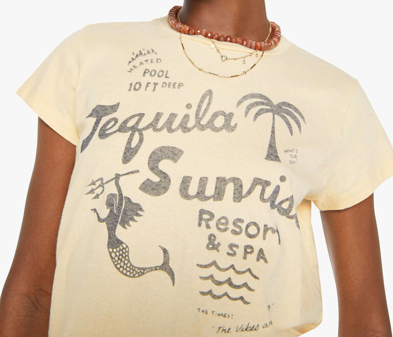 Baja's best. A soft crewneck with a slim fit for a vintage look and feel. Made from stretch cotton in pale peach, the tee features a vintage resort-inspired graphic with a mermaid, palm tree and text in faded black on the front and in orange on the back.