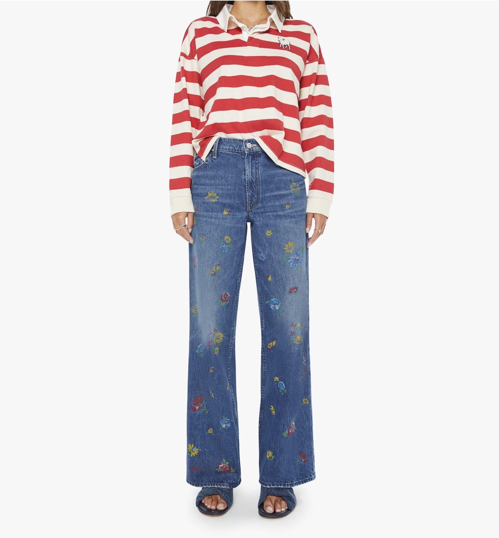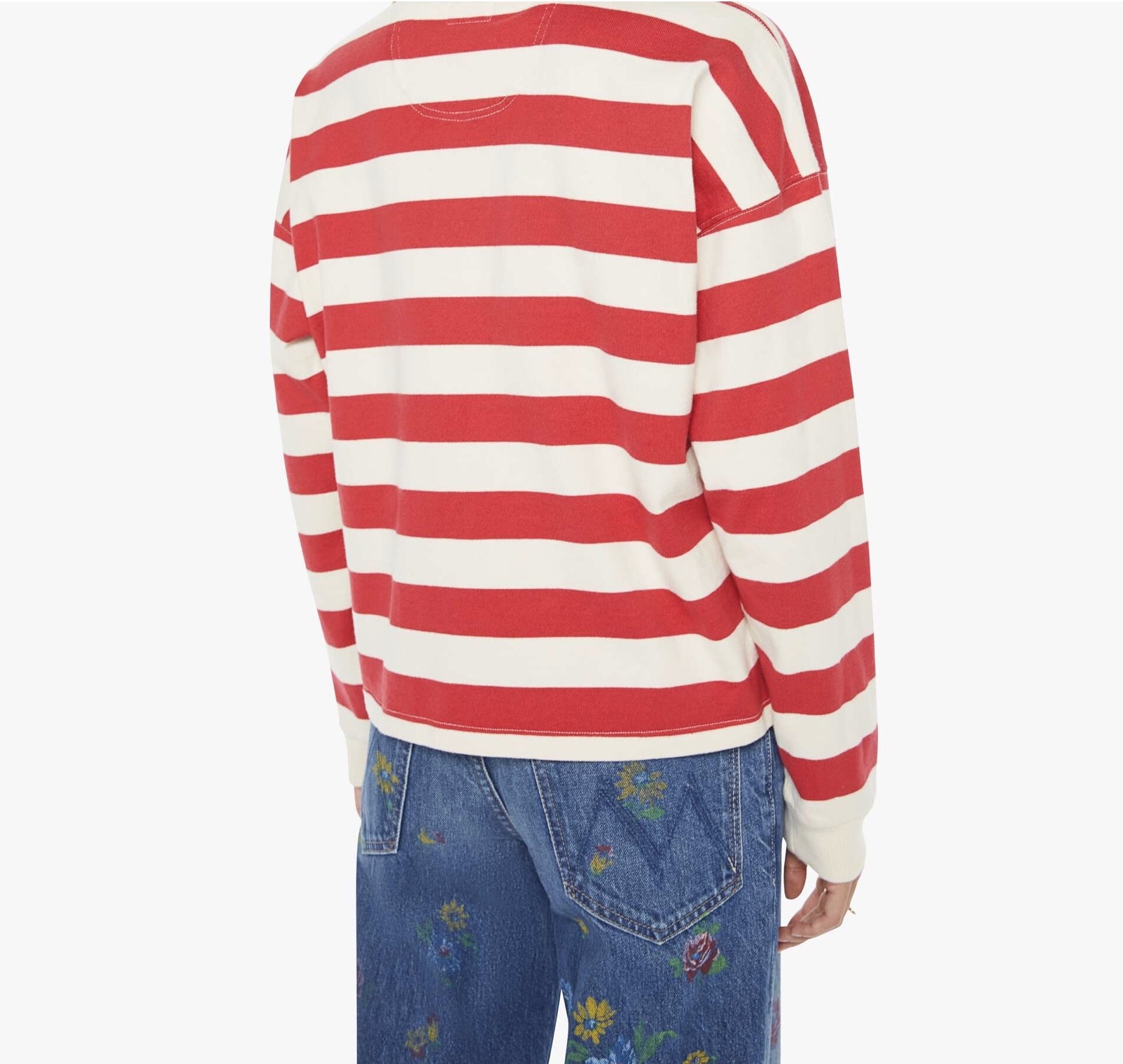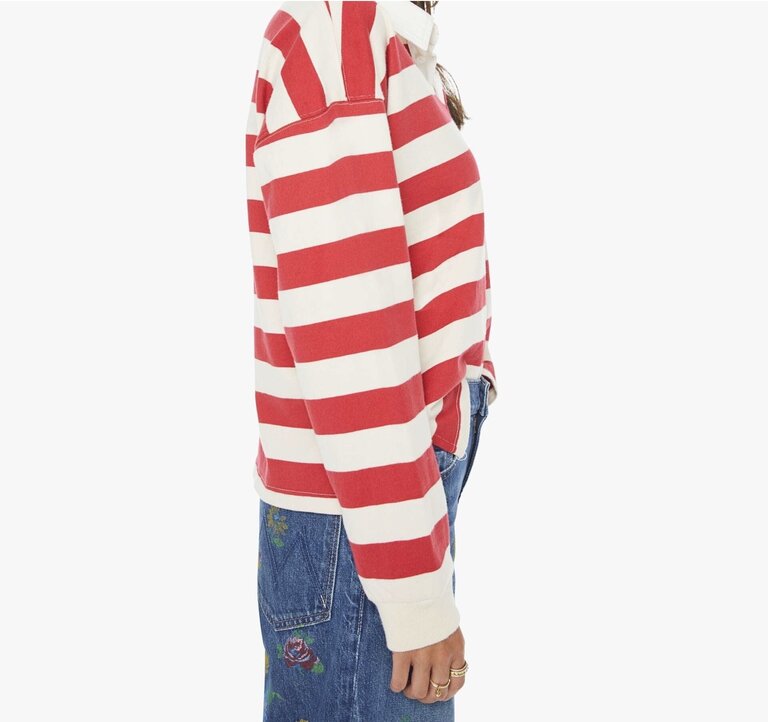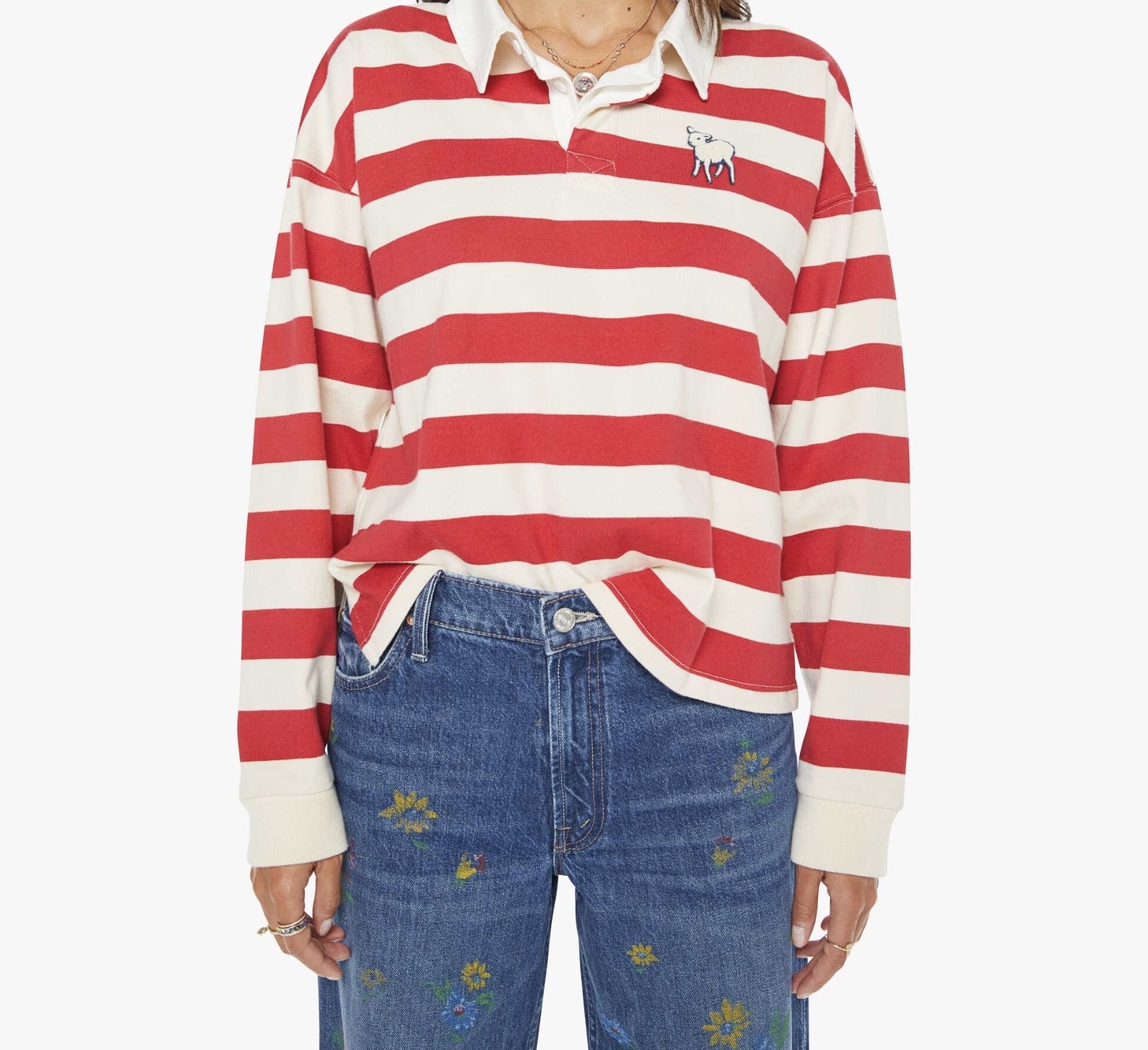 MOTHER's take on the rugby shirt features drop shoulders and an oversized fit. Made from a recycled cotton blend, the top is designed in off-white and red stripes with a fuzzy lamb patch on the chest.