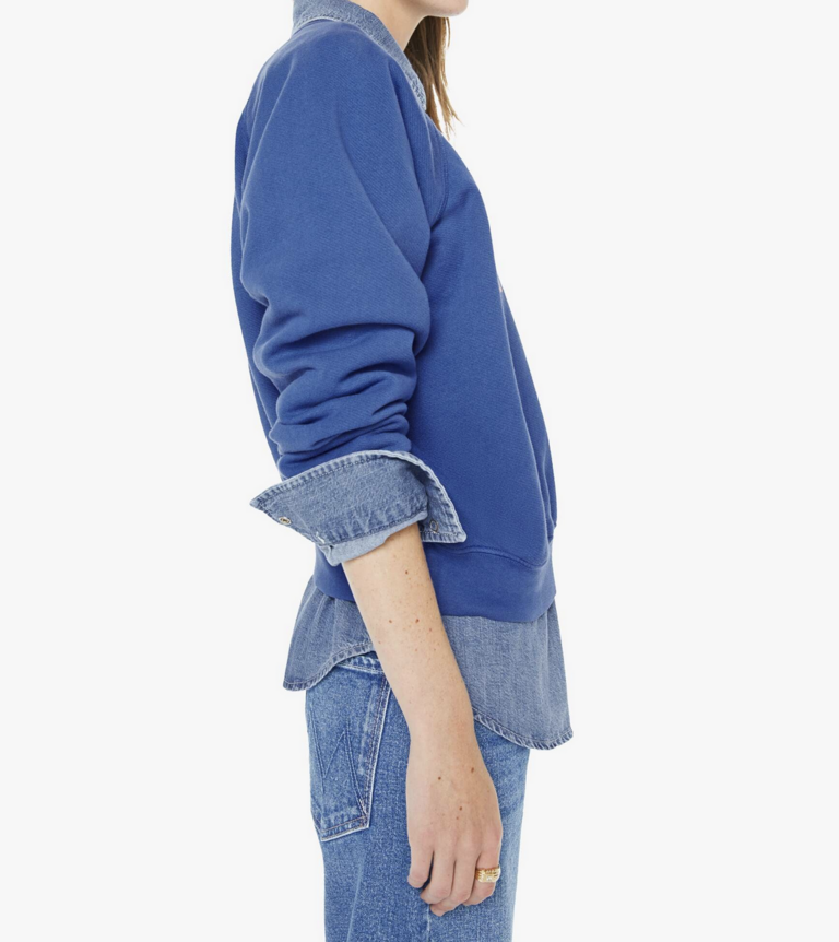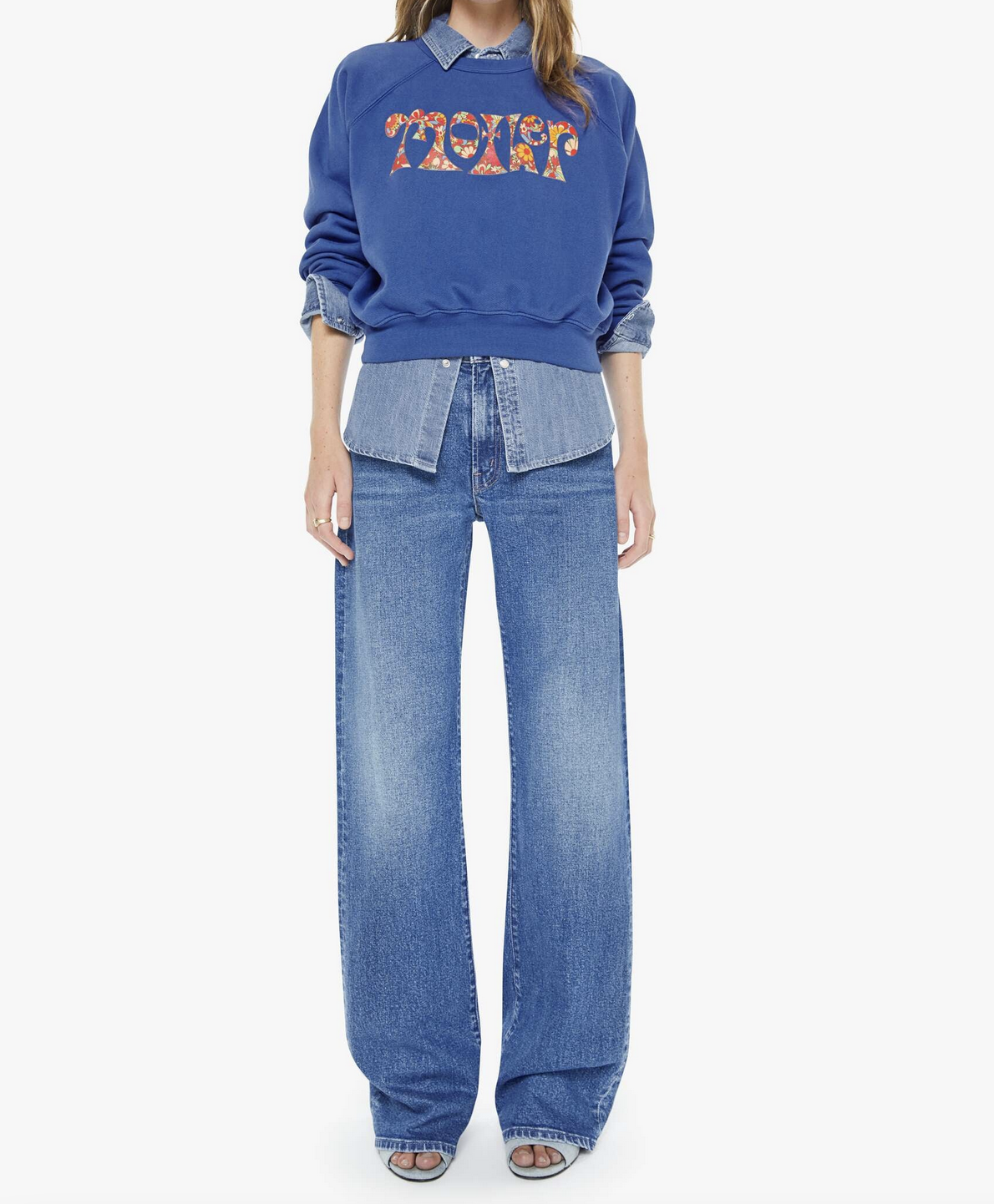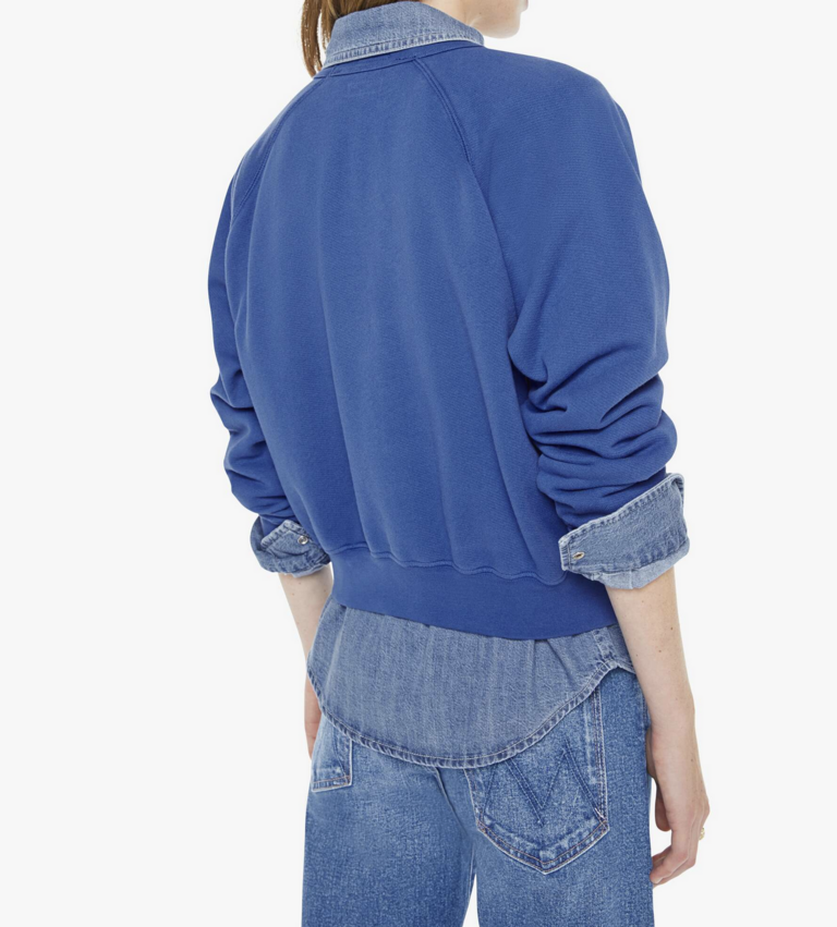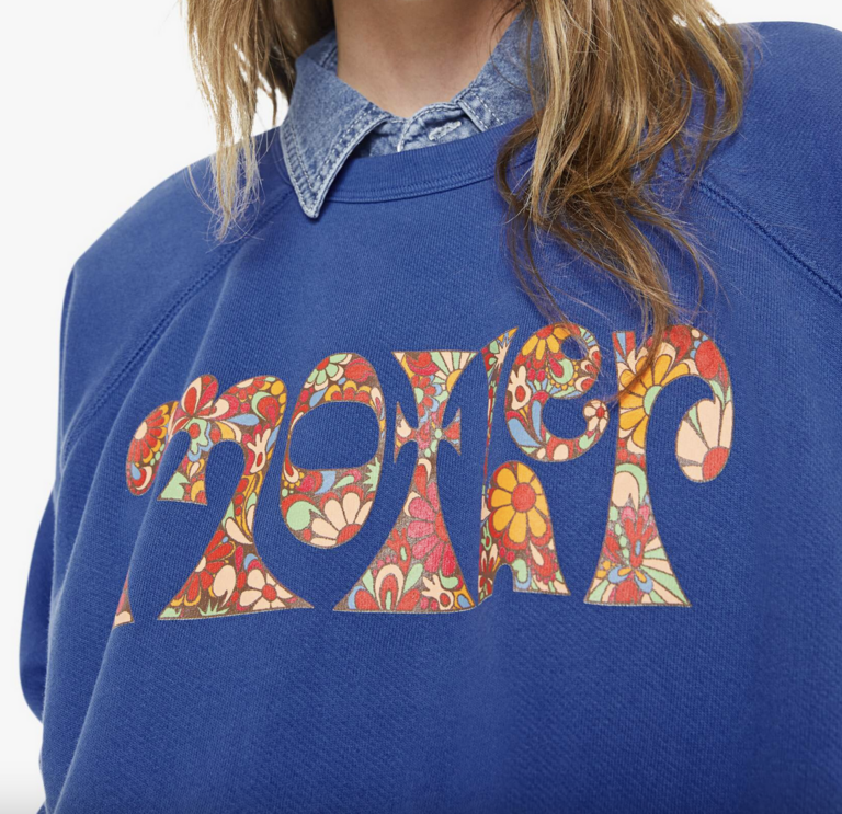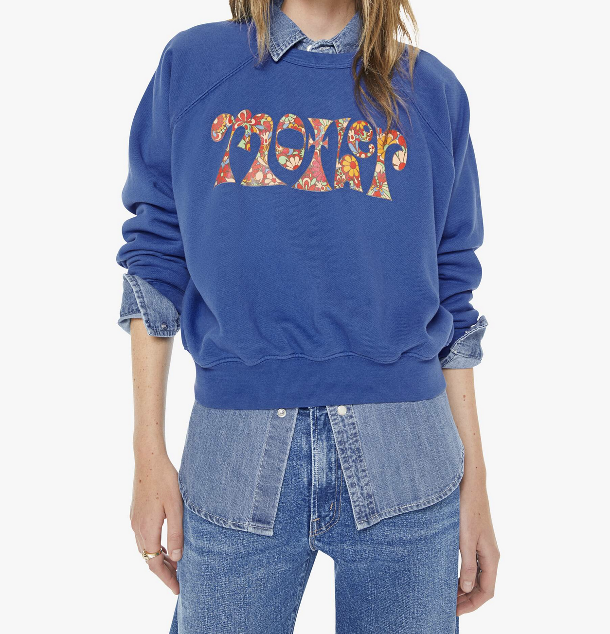 Petal power. A raglan sweatshirt with a crewneck, ribbed hems and a slightly cropped fit. Made from super-soft 100% cotton, the sweatshirt is designed in blue with MOTHER's name in floral block text on the front.