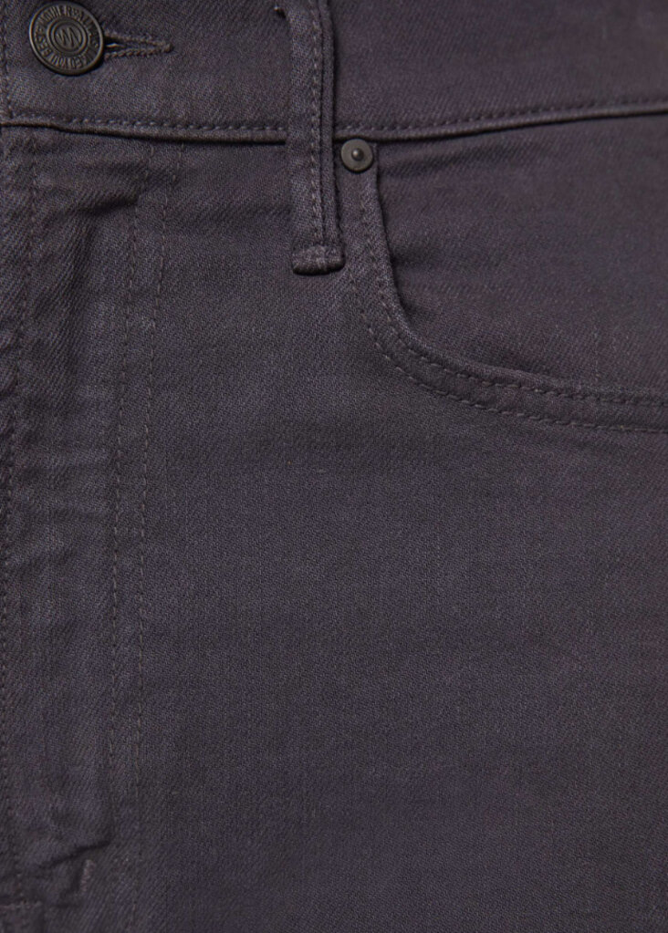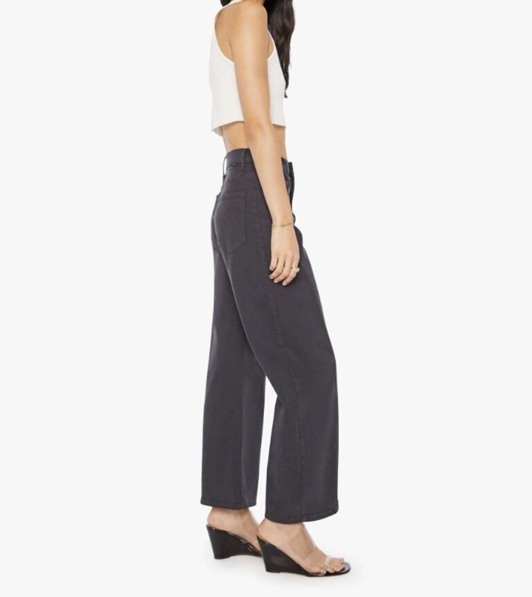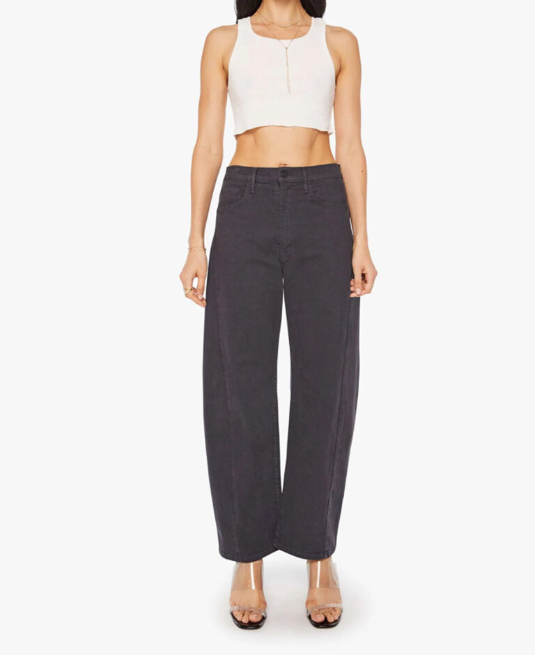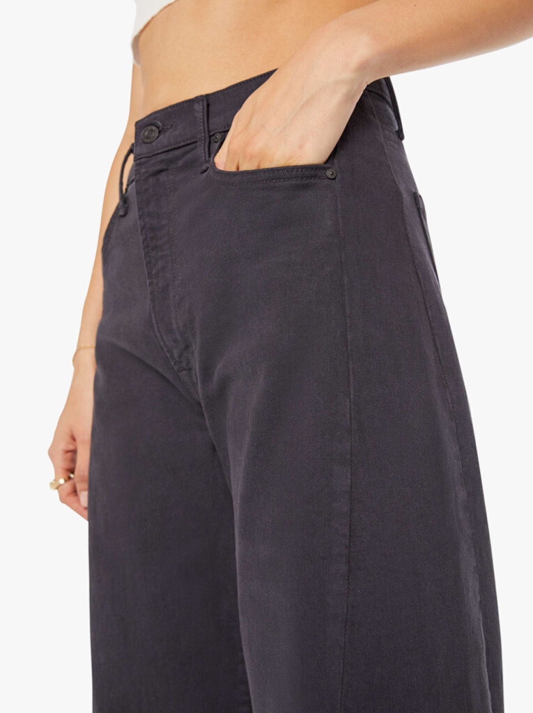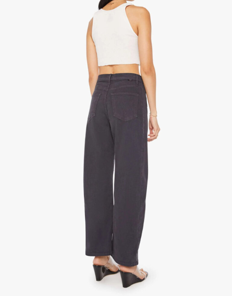 A super high-waisted pant with a wide, curved leg, zip fly, 30-inch inseam and a clean hem. Cut from a stretch cotton blend, the pants are designed in faded black with tonal hardware.