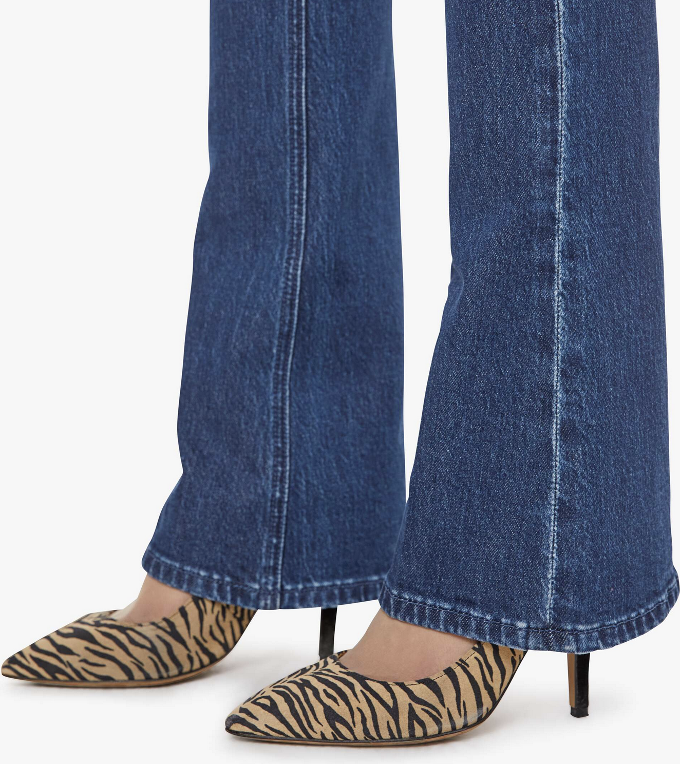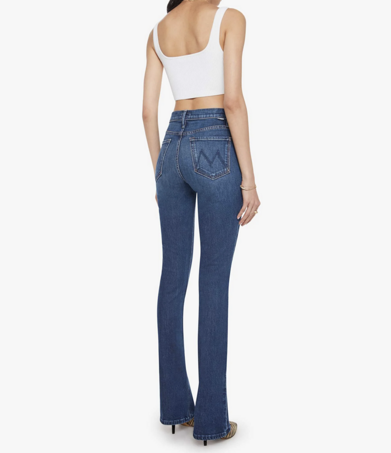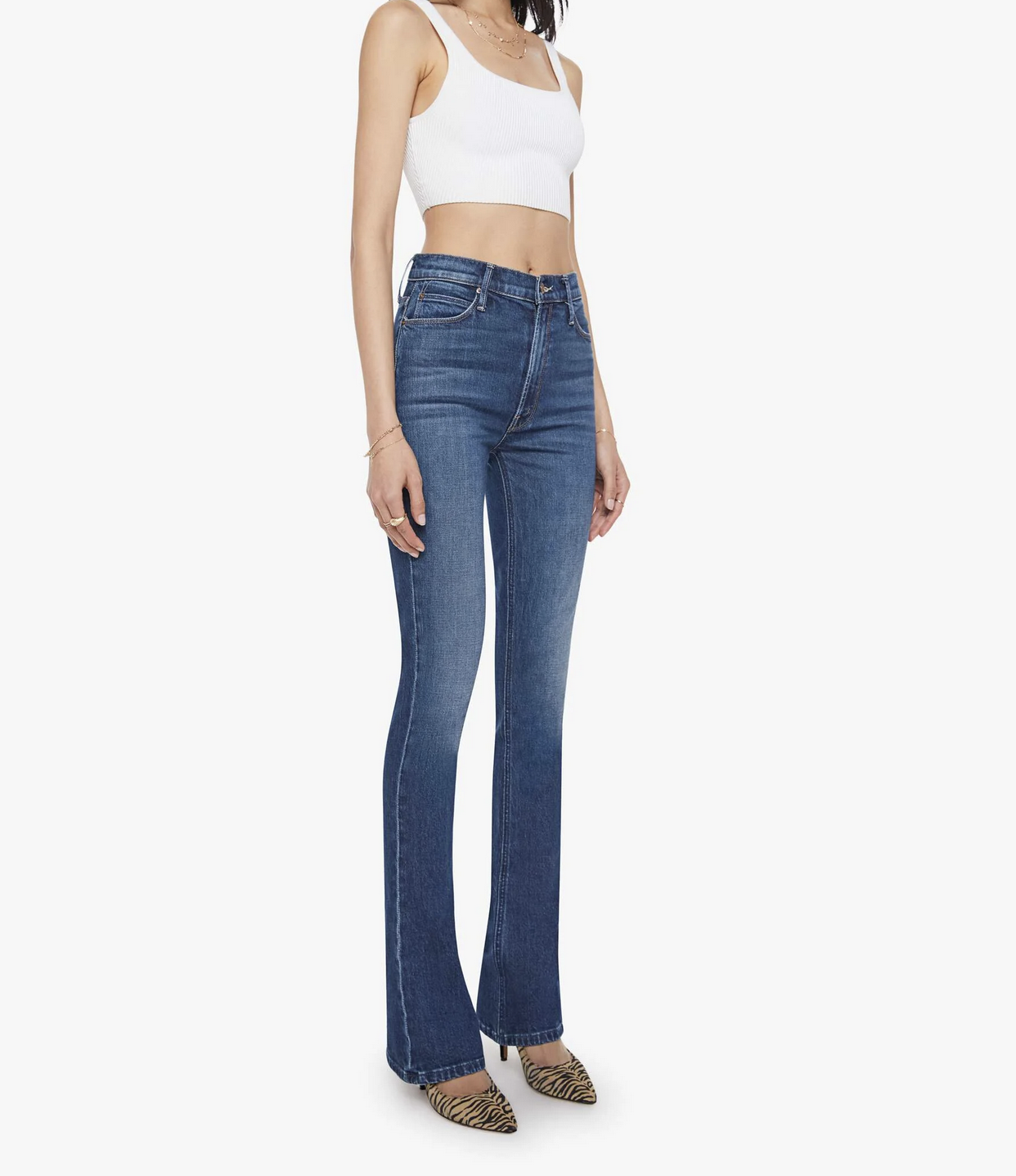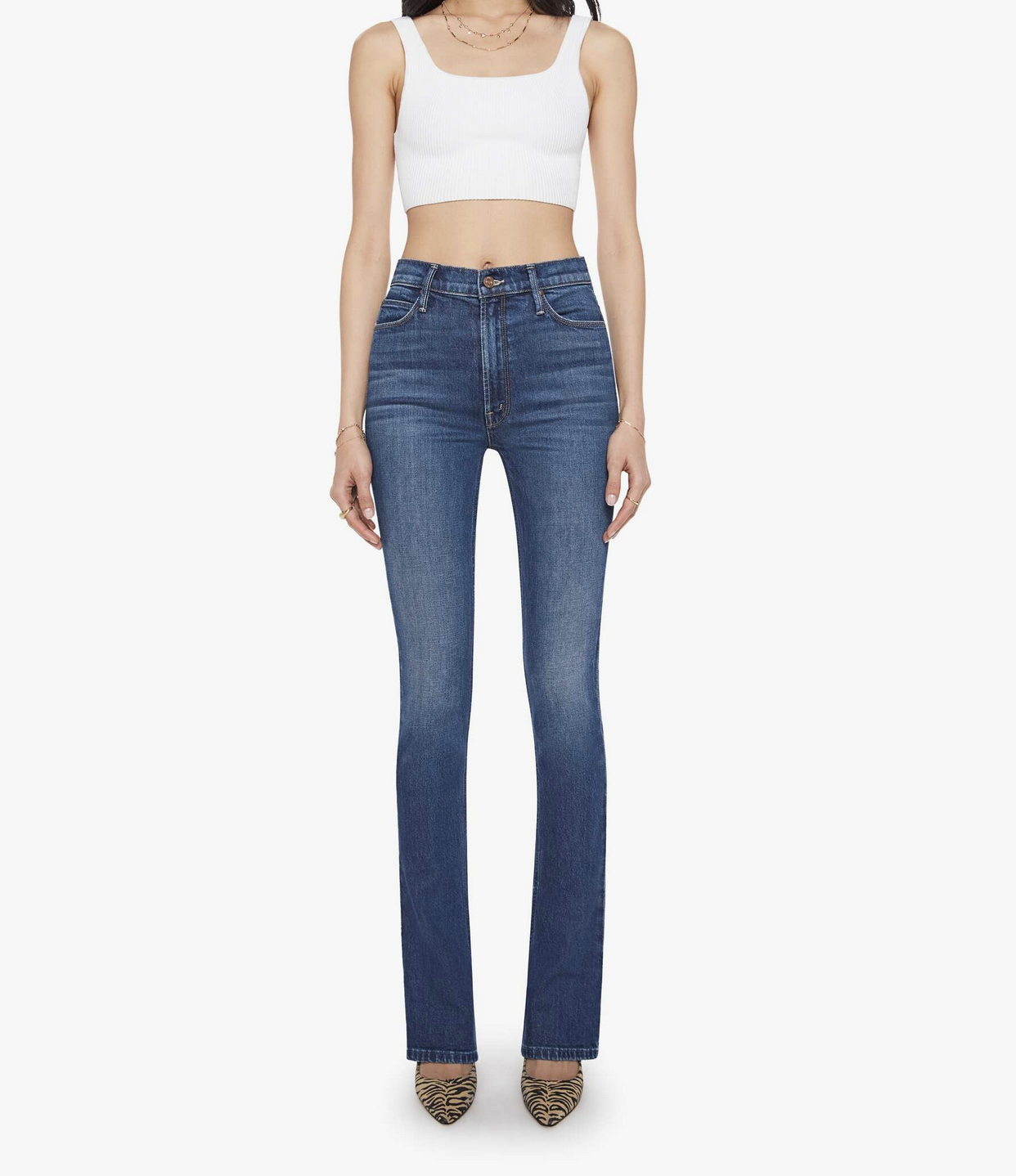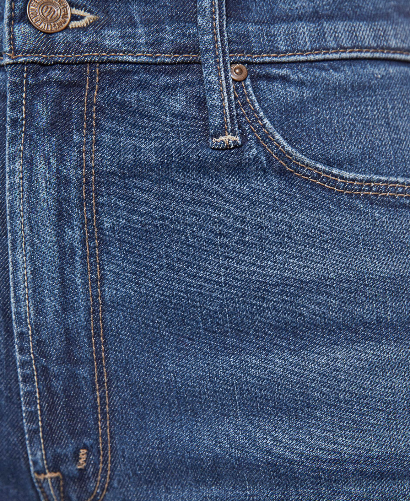 Star power. A classic skinny flare with a high rise, zip fly and a long 34-inch inseam with a clean hem. Made from denim with a touch of stretch, Shine On is a dark blue with whiskering and fading at the knees.