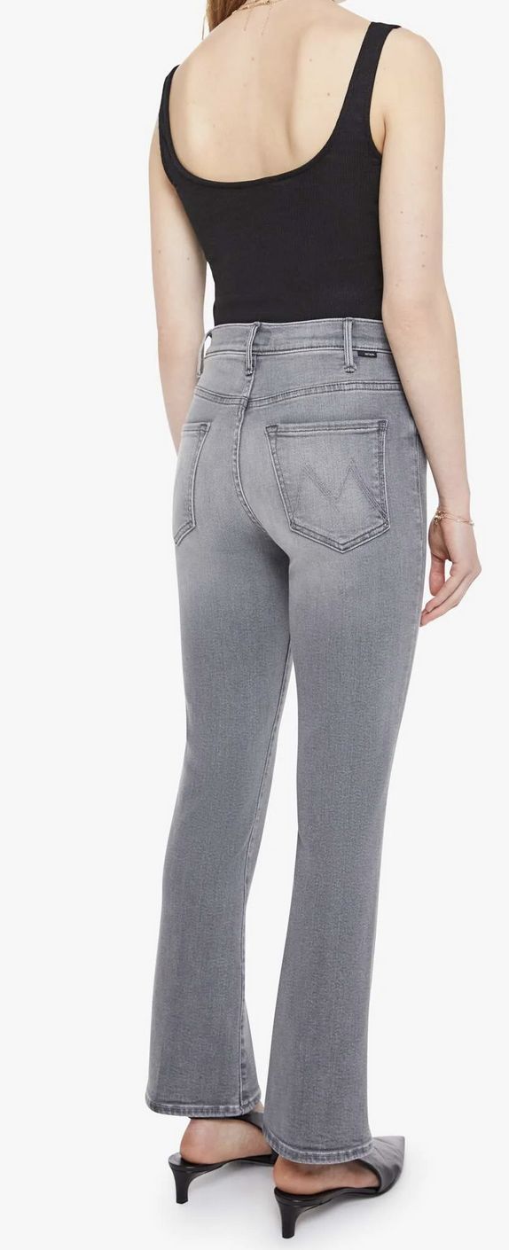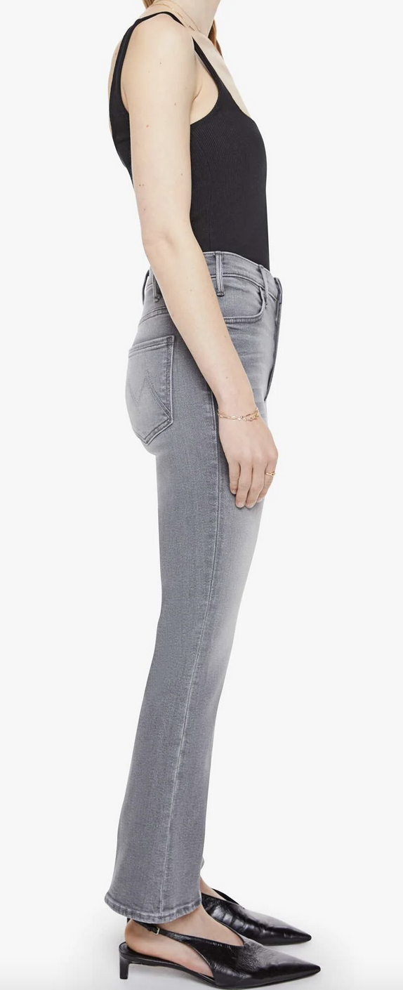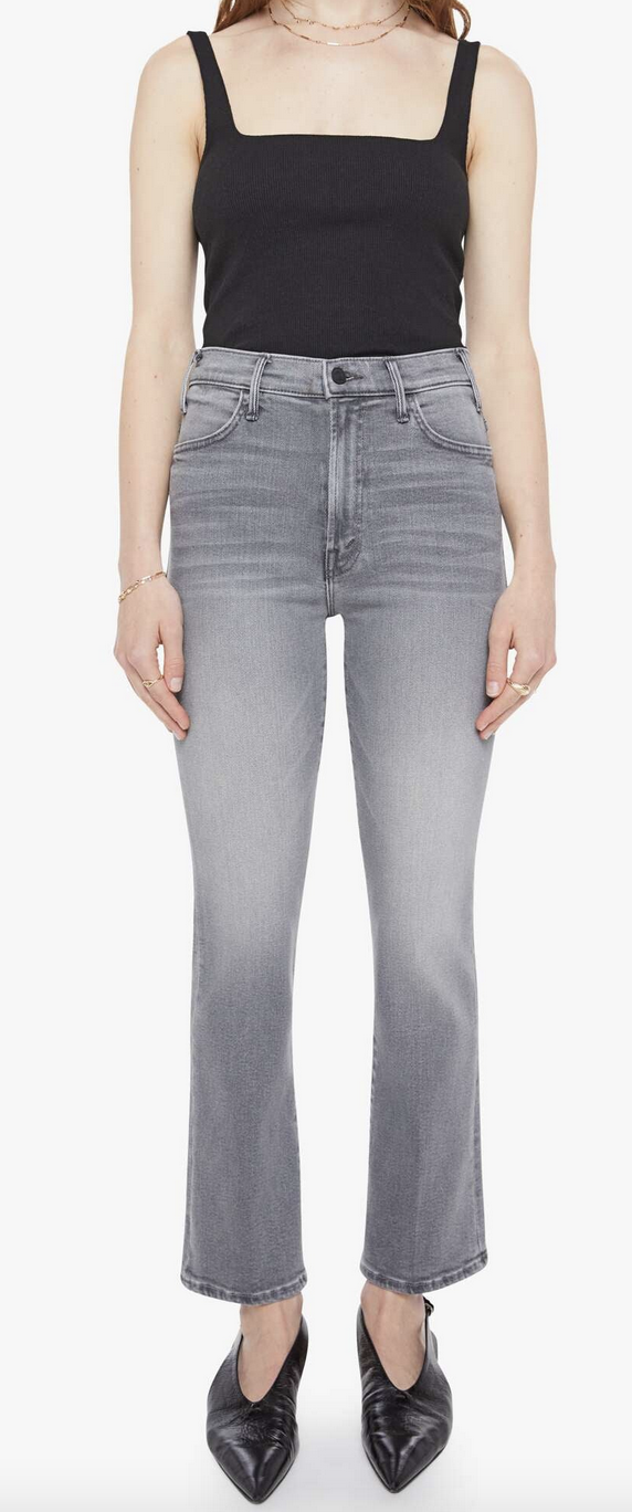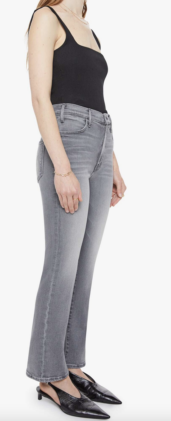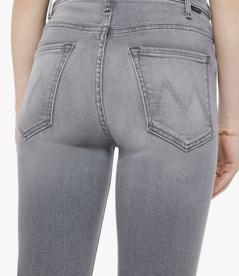 Hoofin' it. This bestselling high-rise flare has a zip fly, ankle-length inseam and a clean hem. Made from stretch denim, Escape Goat is a light grey with whiskering, fading and black hardware.
