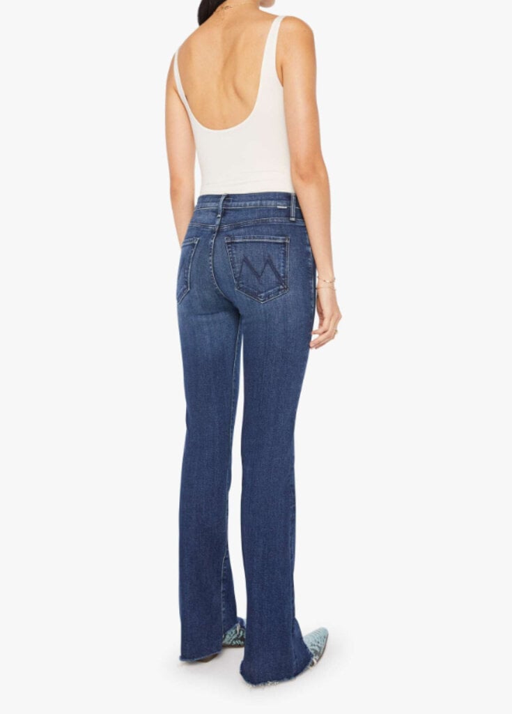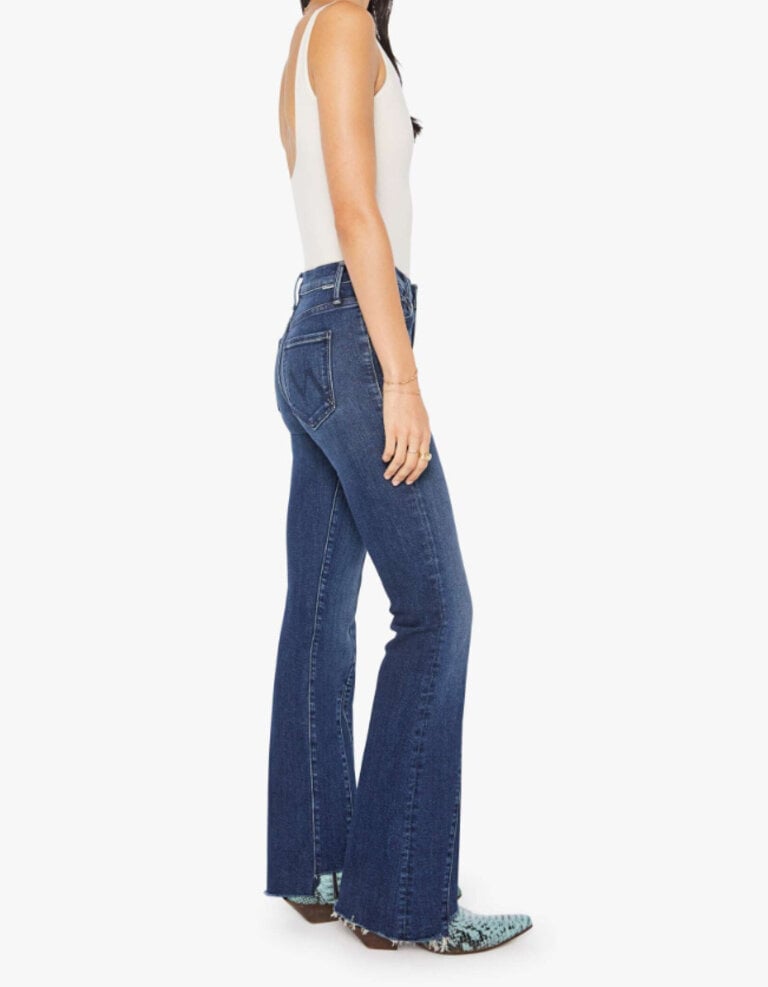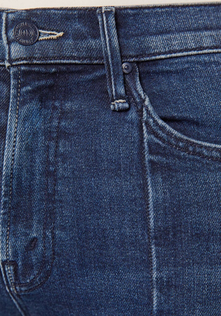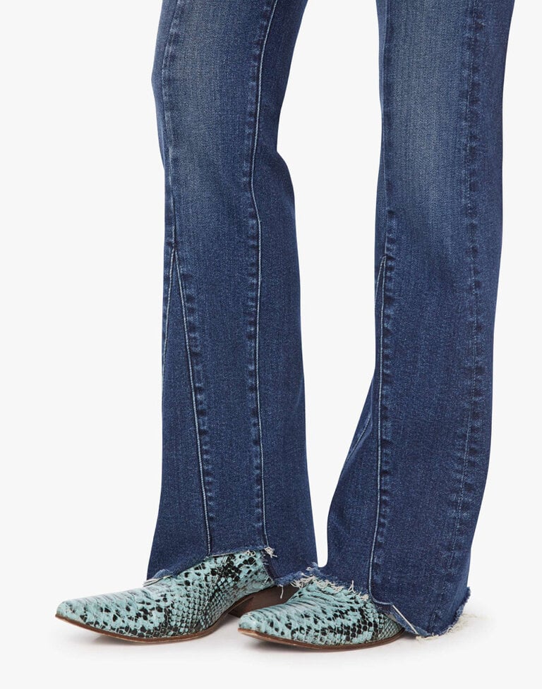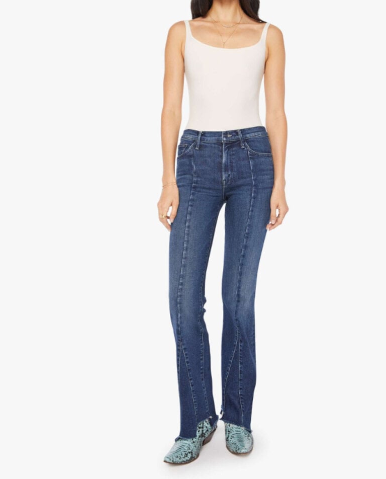 Life of the party. This iconic high-waisted bootcut features a zip fly, seamed details down the front, a 31-inch inseam and a frayed triple step-hem. Made from stretch denim, You're A Riot is a dark blue with subtle whiskering and fading at the knees