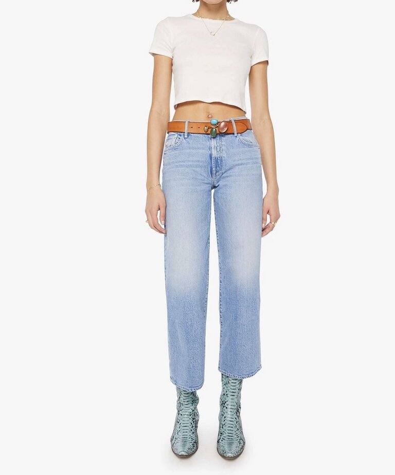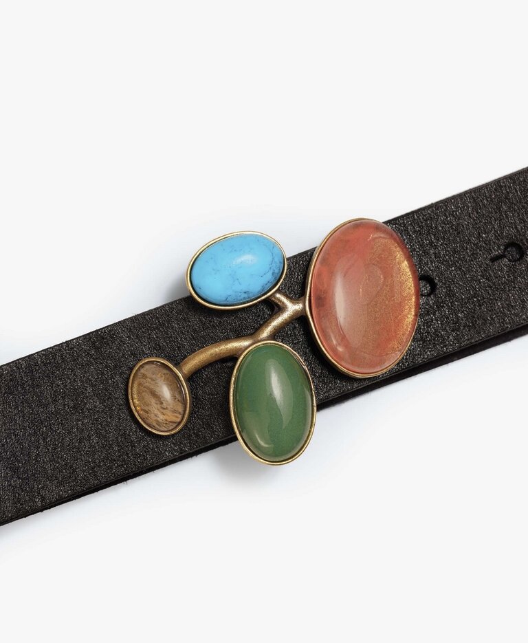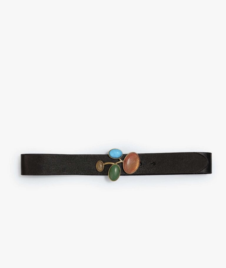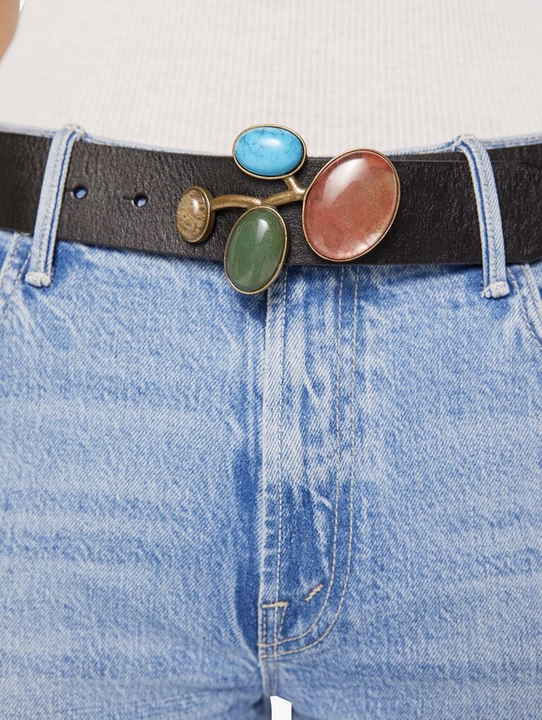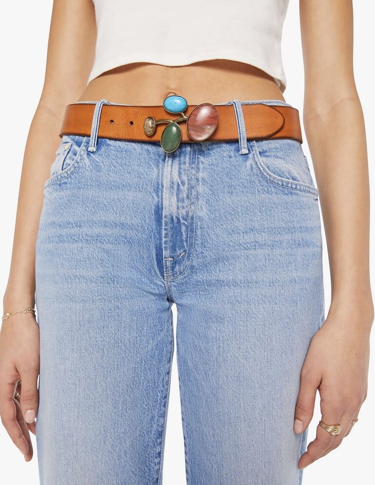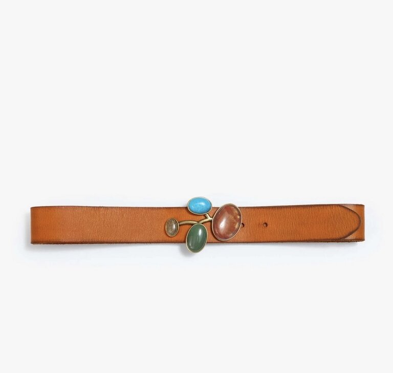 Buckle up. A wide, vintage-inspired leather belt with a chunky metal buckle detailed with turquoise, amber, green and pale yellow stones. The Jewelry Box is made from 100% cow leather in brown with subtle distressed details.