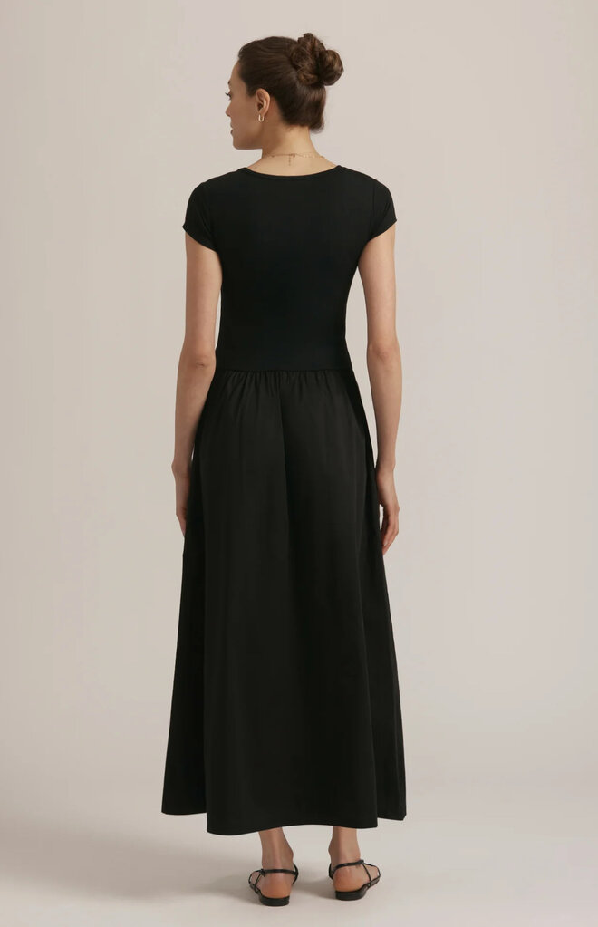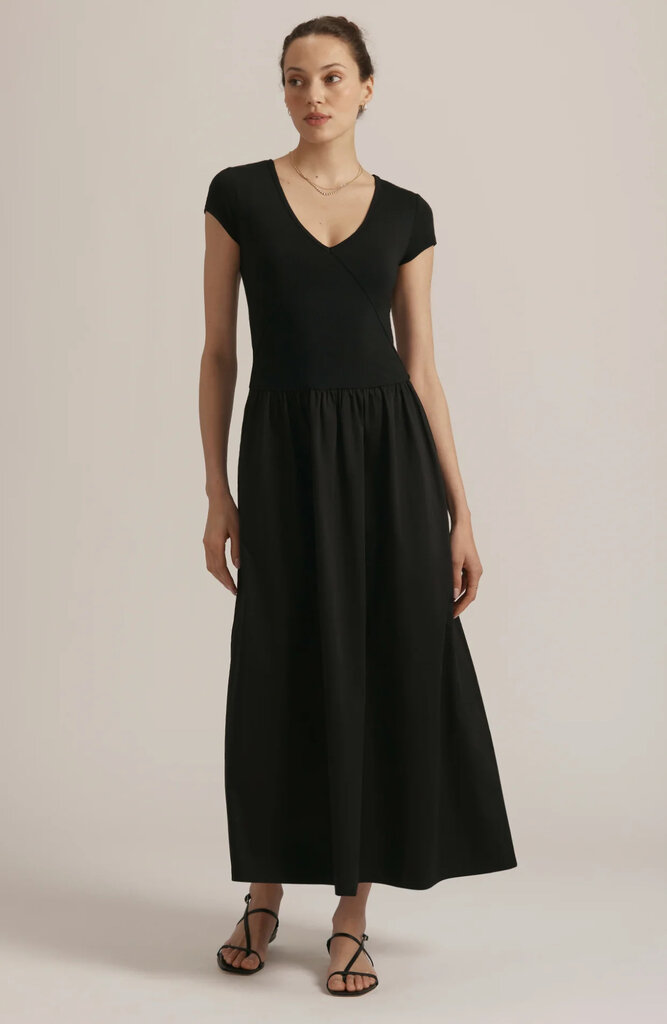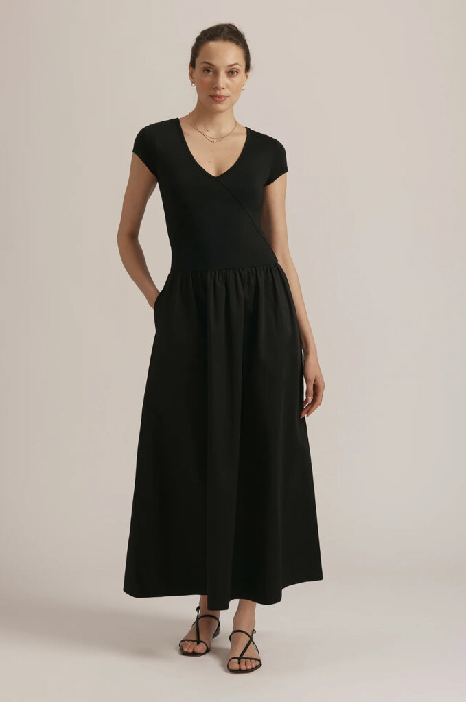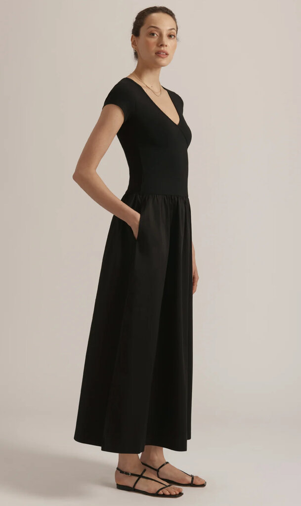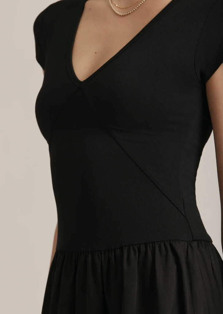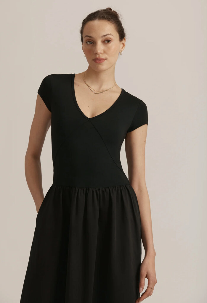 A little bit classic, a little bit fresh. The Madison Dress combines a flattering V-neck jersey knit bodice with cap sleeves and a full, flirty poplin skirt.
