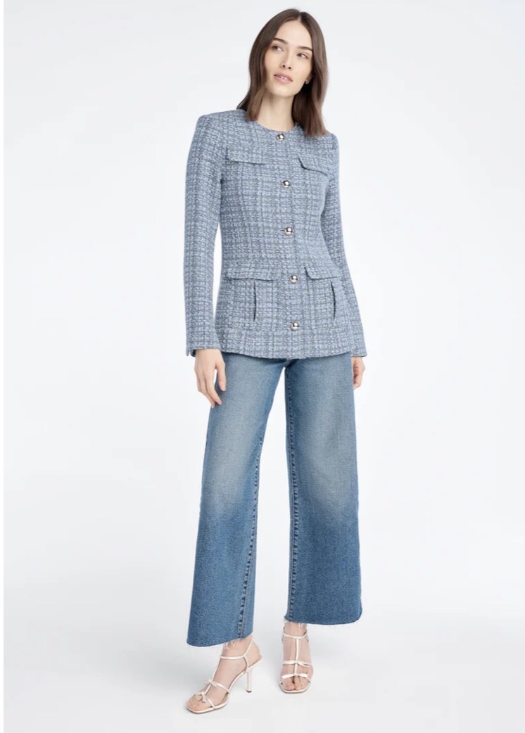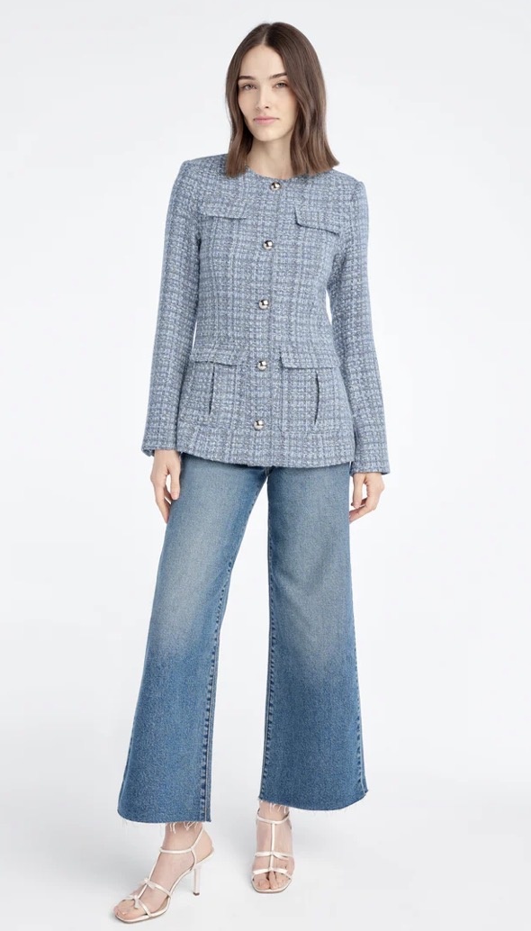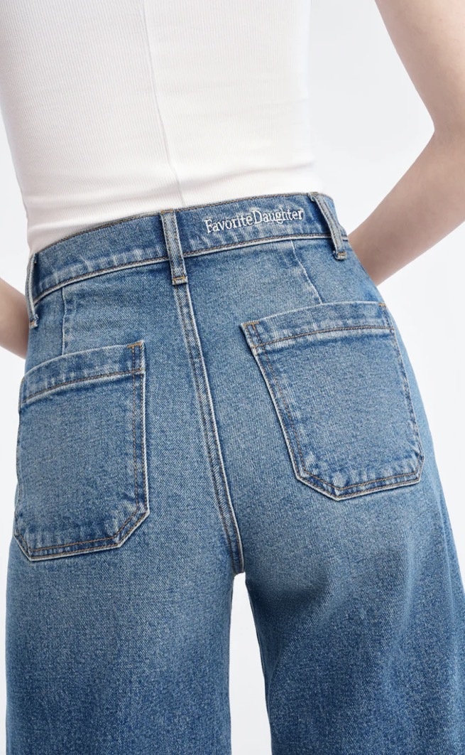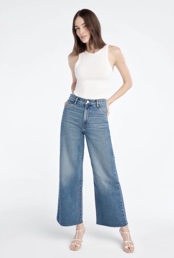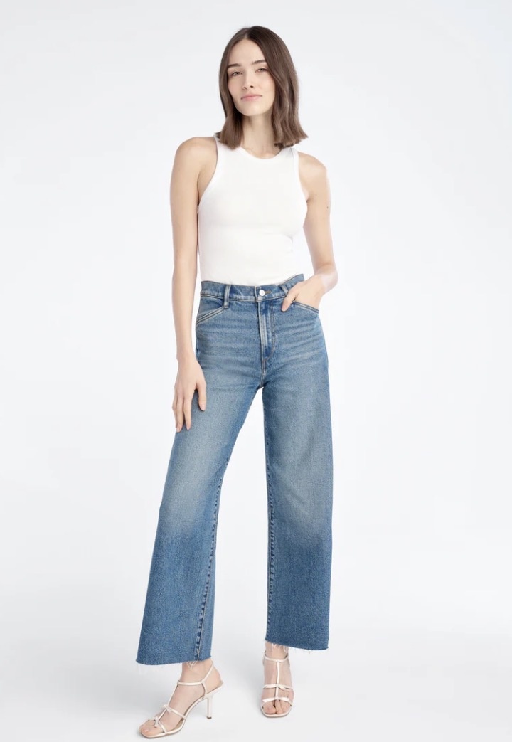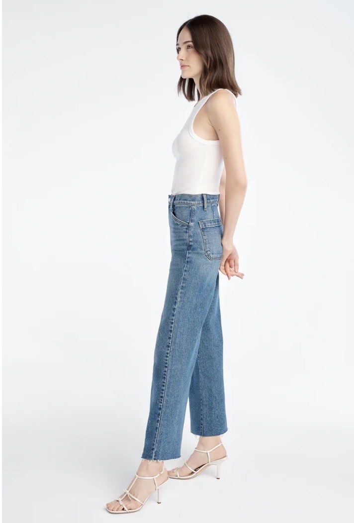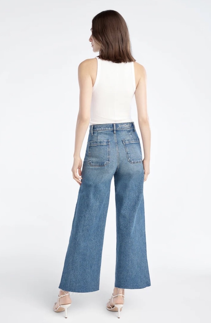 A super high-rise, wide-leg jean that's pinched at the waist, easy at the hips and hits at the ankle. Features a cut wide hem, front slant pockets, back patch pockets and darts for a flattering fit.