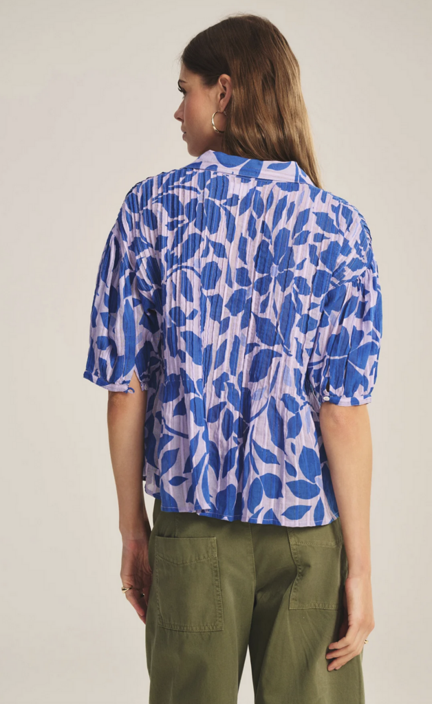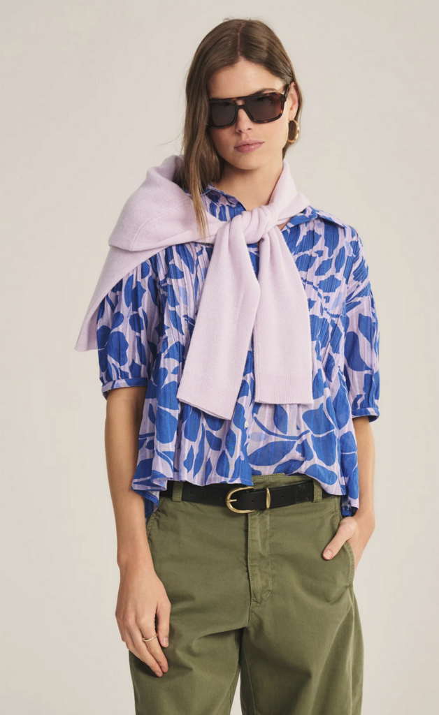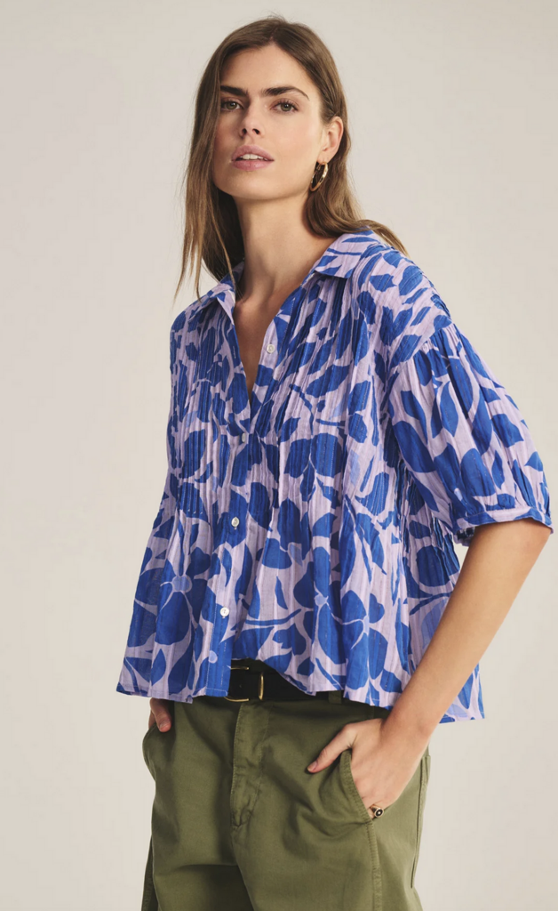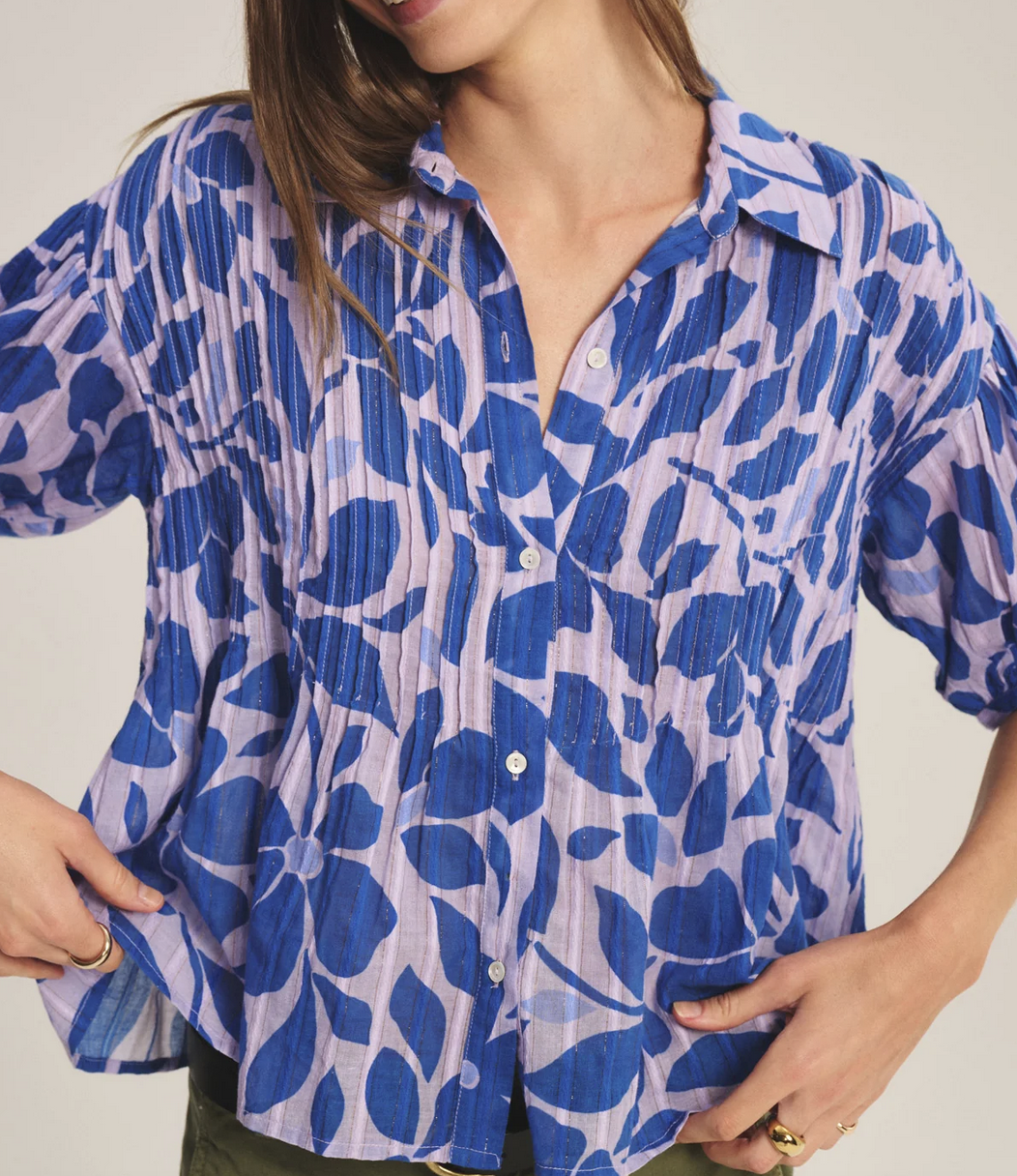 Offering an airy, flowy feel with a hint of sheer, this cotton top is threaded with metallic lurex for a subtle luminous effect. A full button front and classic collar meet pleated detailing across the front, shoulders, and back for gentle texture.