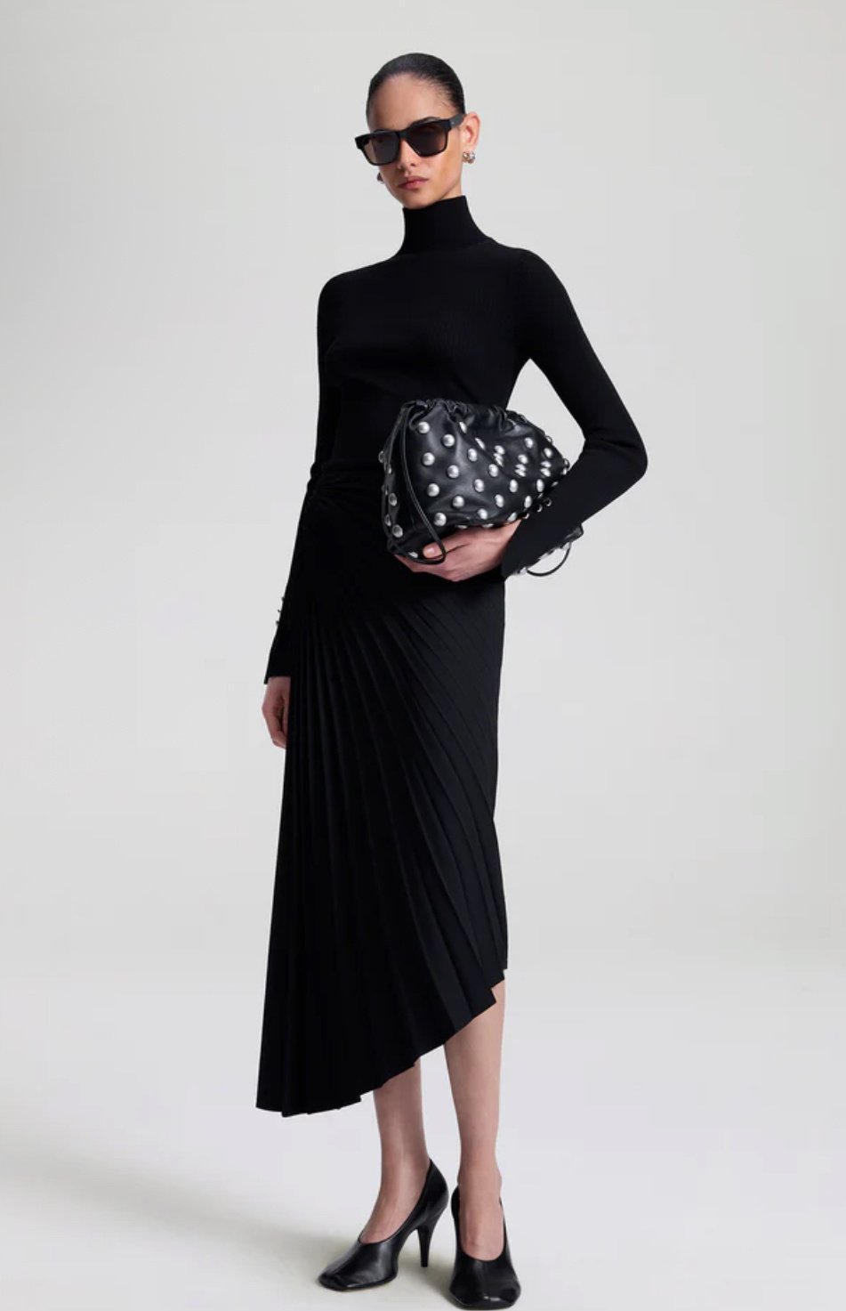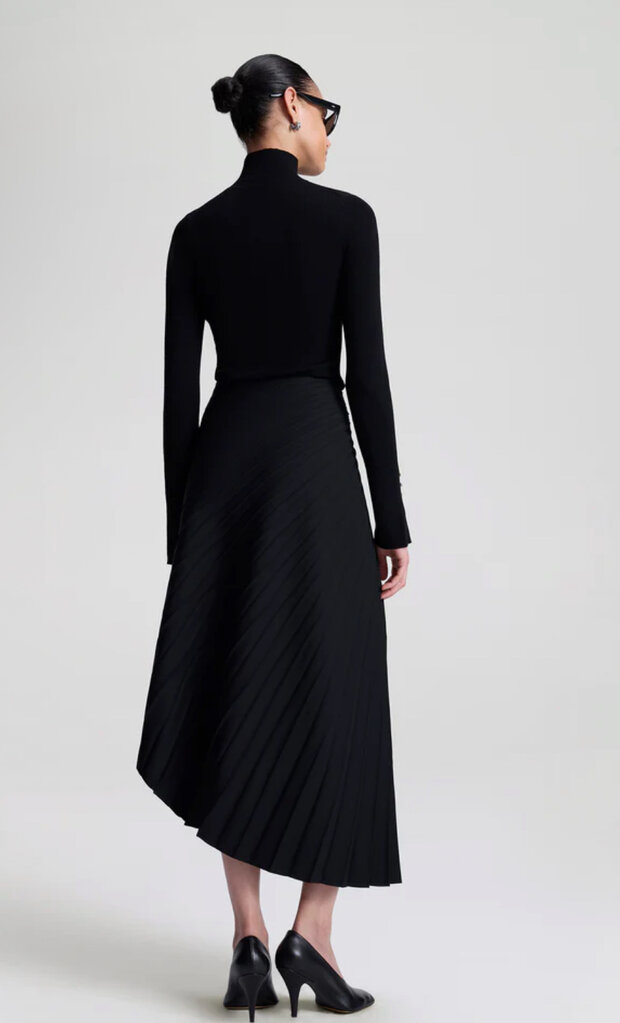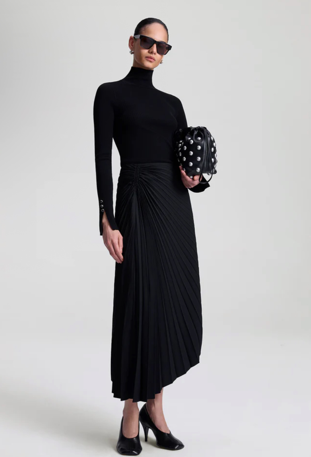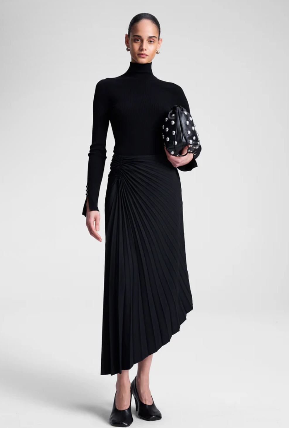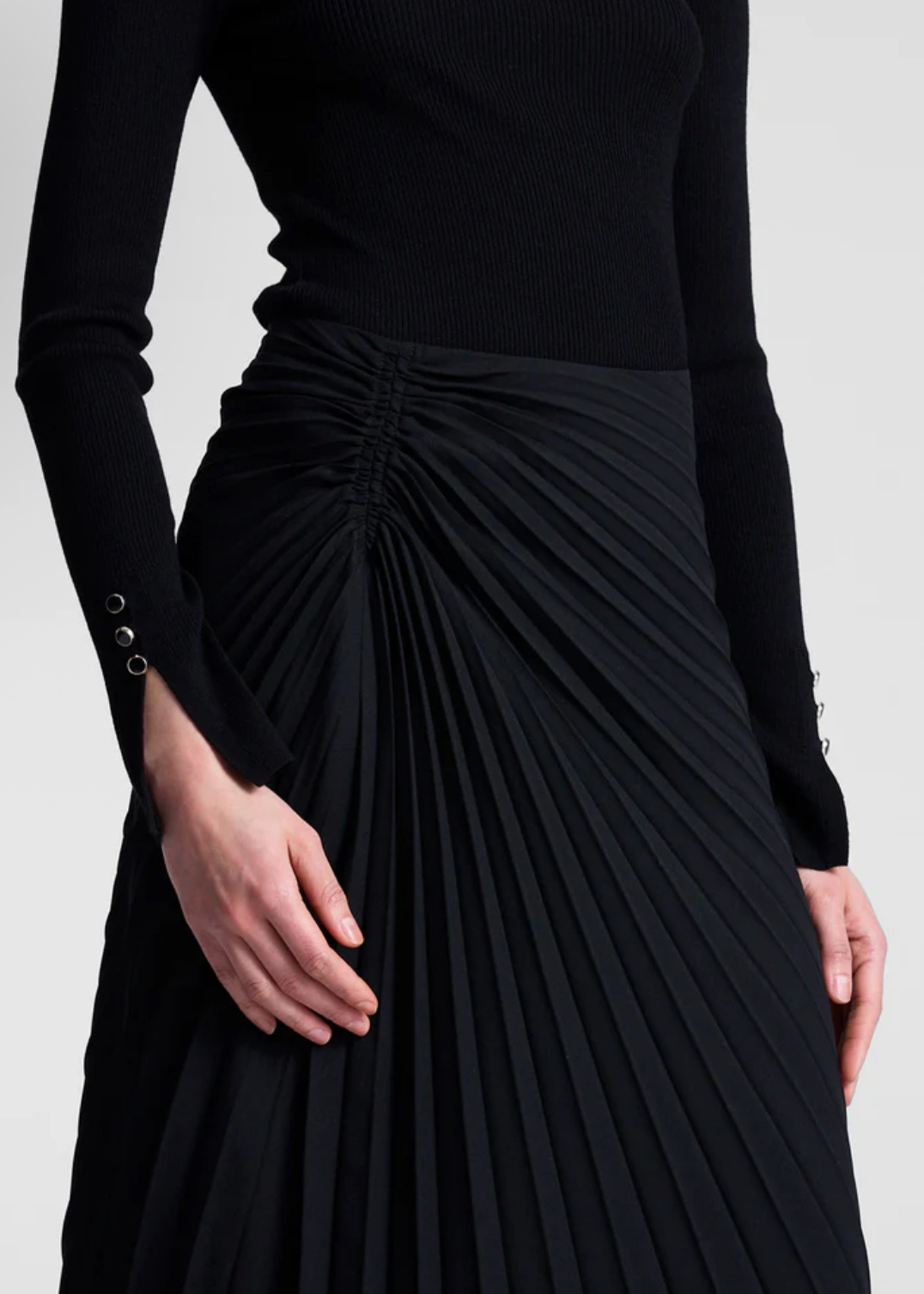 Cut from our new suiting twill with soft structure and fluid drape. Sunburst pleats fall from the ruched hip detail into a fishtail hem.