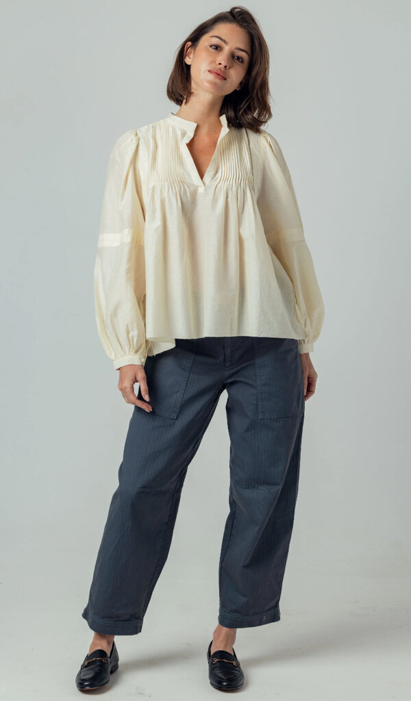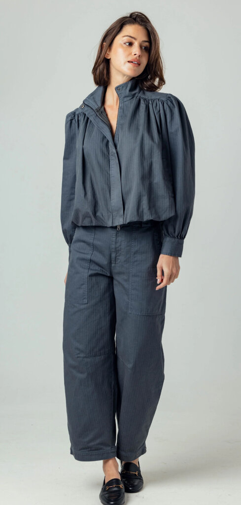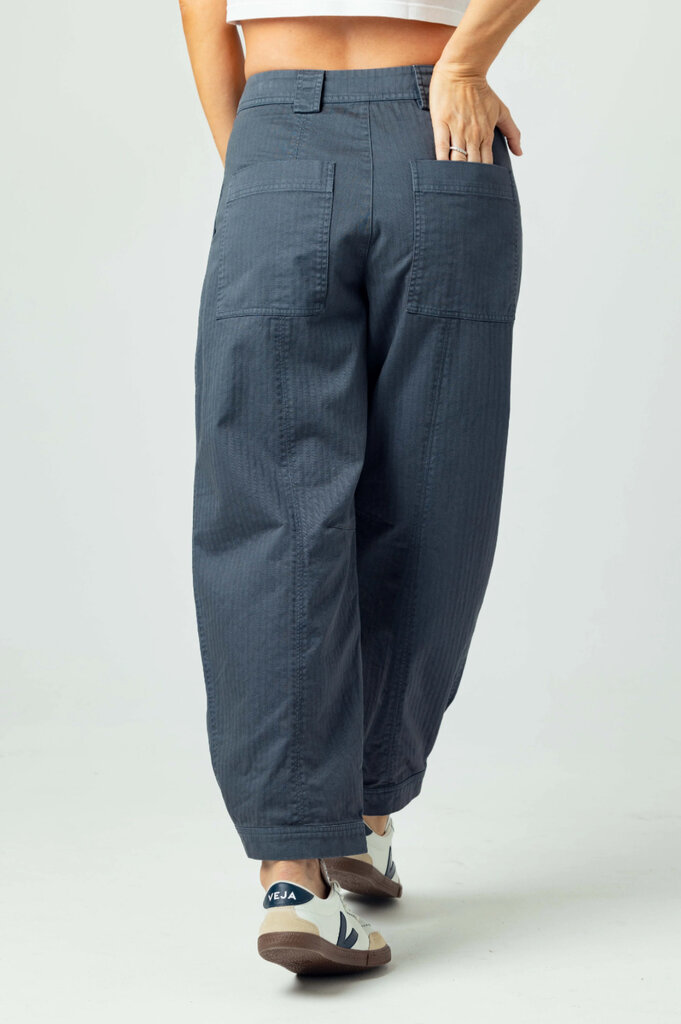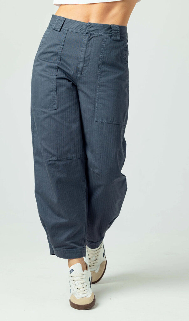 Introducing the Twill Sawyer Pant—the essential cool girl trouser you'll reach for again and again. Feminine with just enough edge, Sawyer strikes the perfect balance of structure and ease. Finished with a snap cuff, this versatile detail allows you to customize the leg shape: snapped for a subtle, tailored barrel leg or left open for a wider, more relaxed silhouette. The inseam is a bit cropped - finishing right above the ankle of most wearers. The Sawyer pants are garment washed for a soft, lived-in look and feel and pairs effortlessly with the Elodie jacket to create an effortless cool-girl aesthetic.
