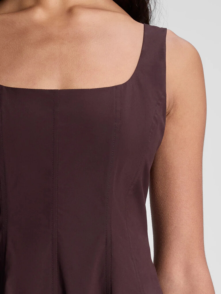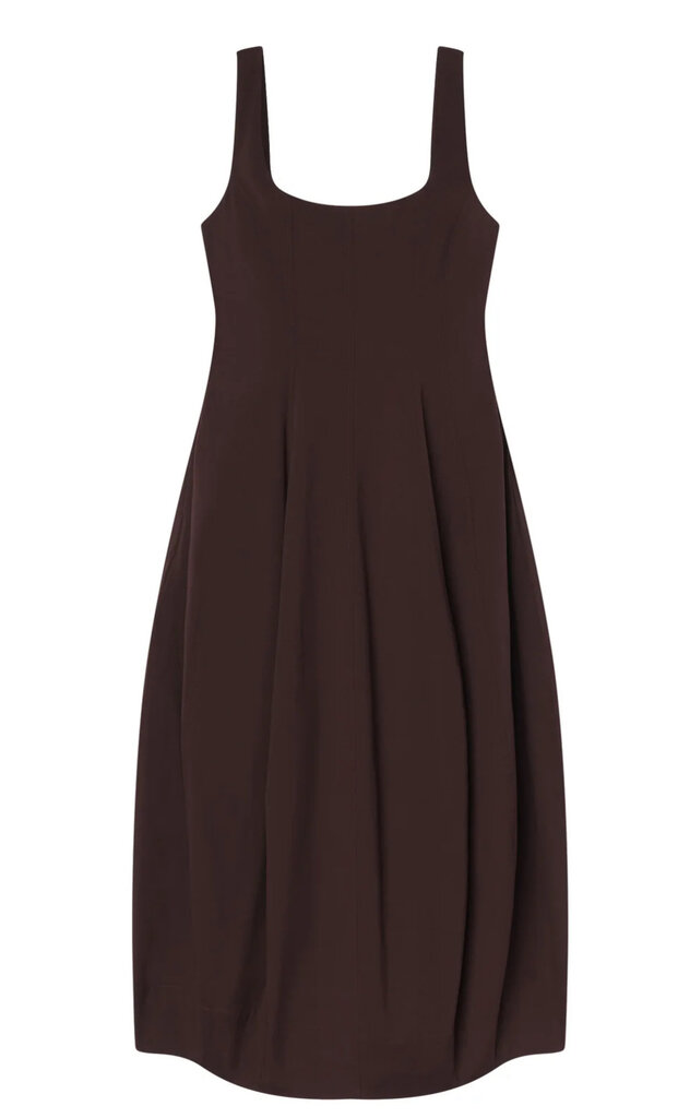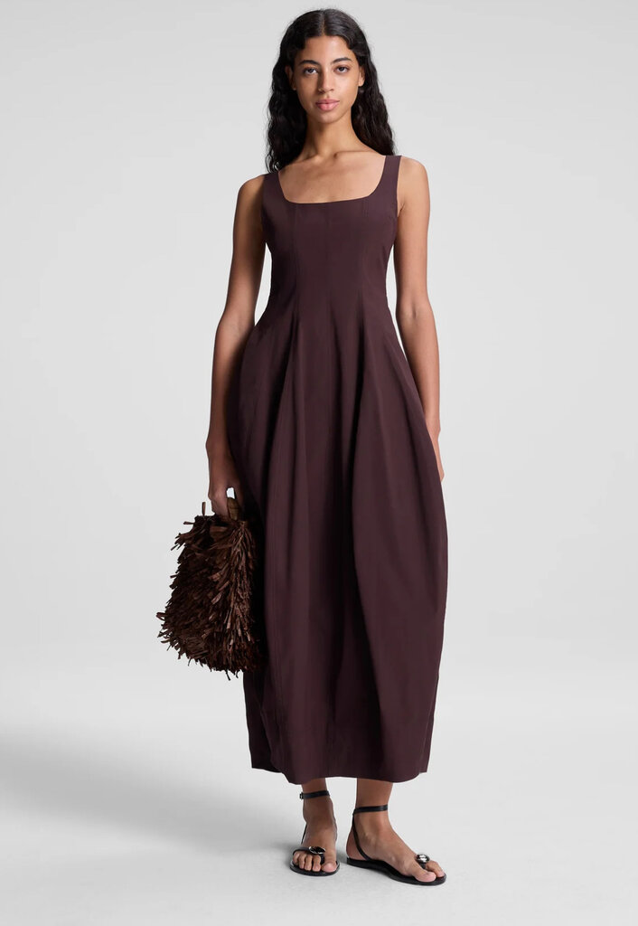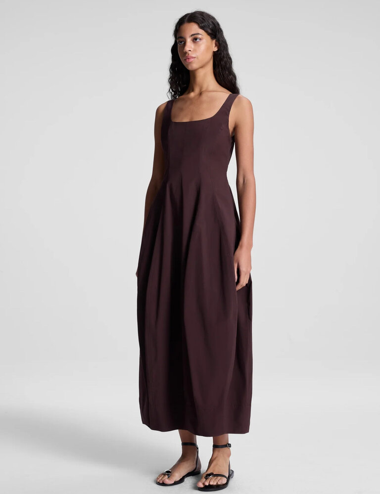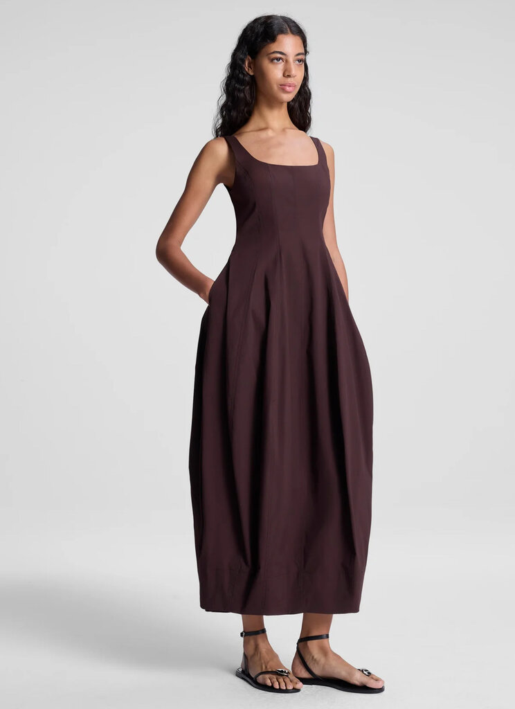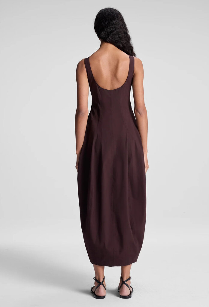 The Veda Dress is crafted from crisp pima stretch poplin in a rich ganache brown. This sleeveless midi silhouette features a clean square neckline, low scoop back, and sculptural volume through the skirt—tempered by vertical seams and discreet side pockets that underscore the clean, minimalist design.