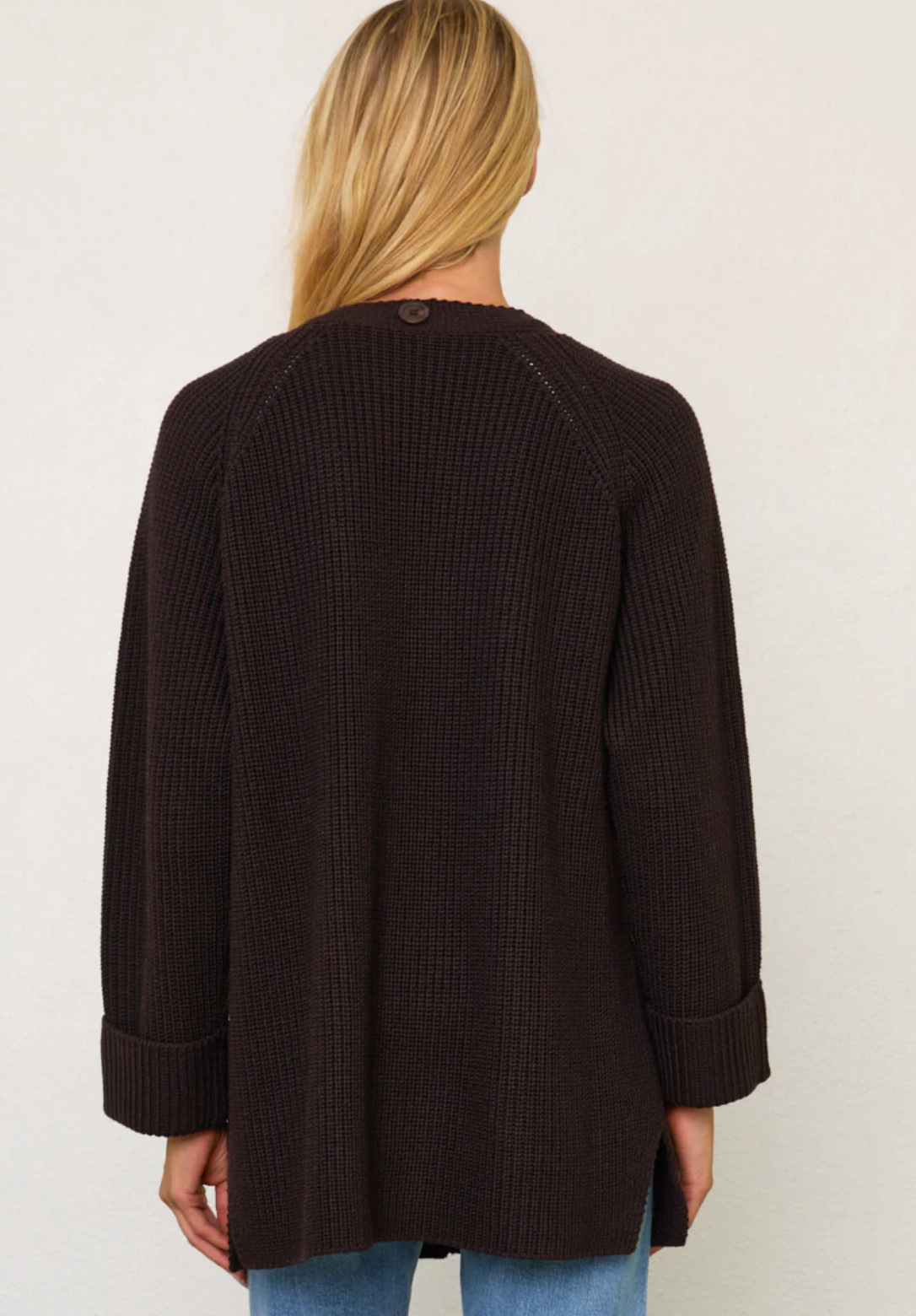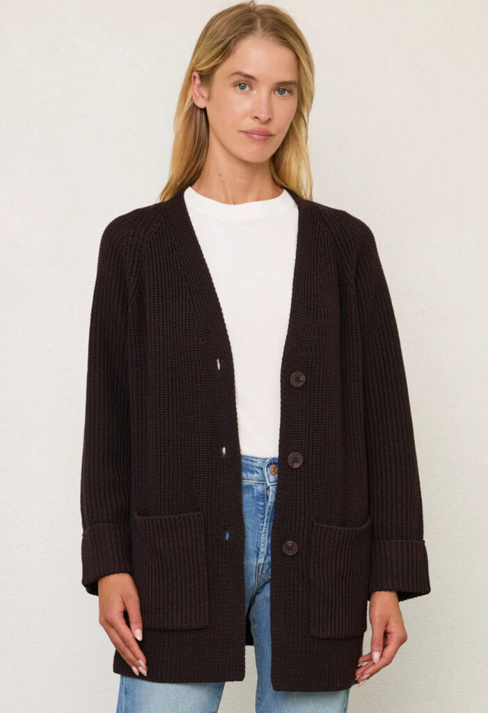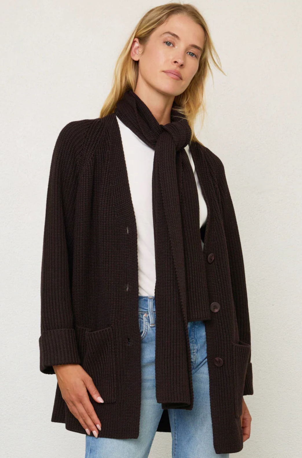 Part coat, part cardigan, part scarf = knitwear heaven. This extra-warm, ribbed V-neck coat includes a matching, detachable scarf. Sleeves are full and cuffed to provide extra warmth, while patch pockets allow for easy access to your phone, keys and glove
