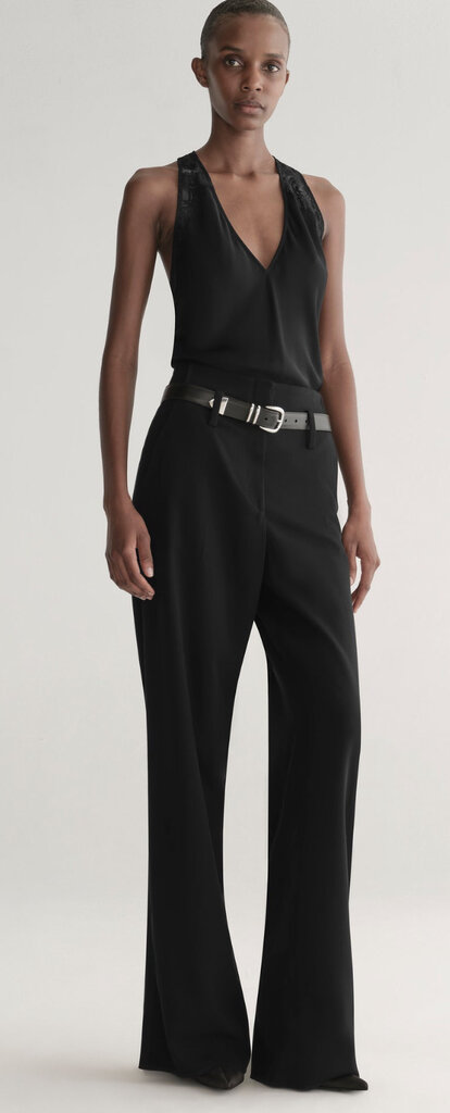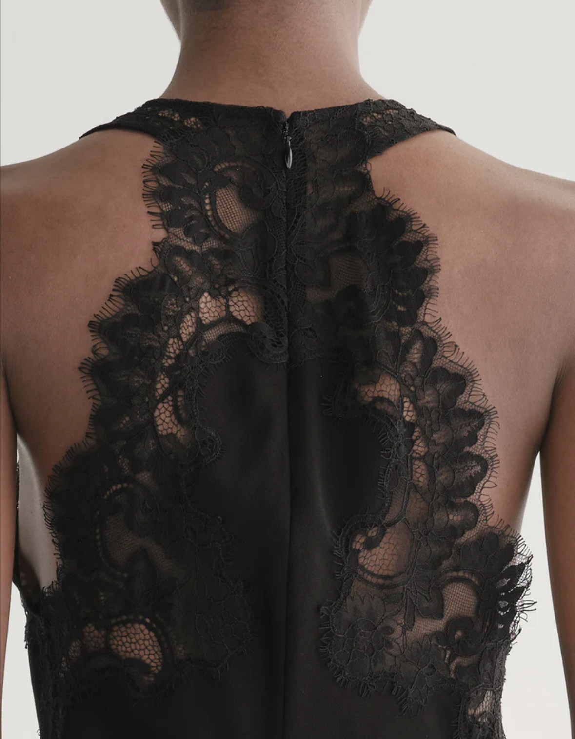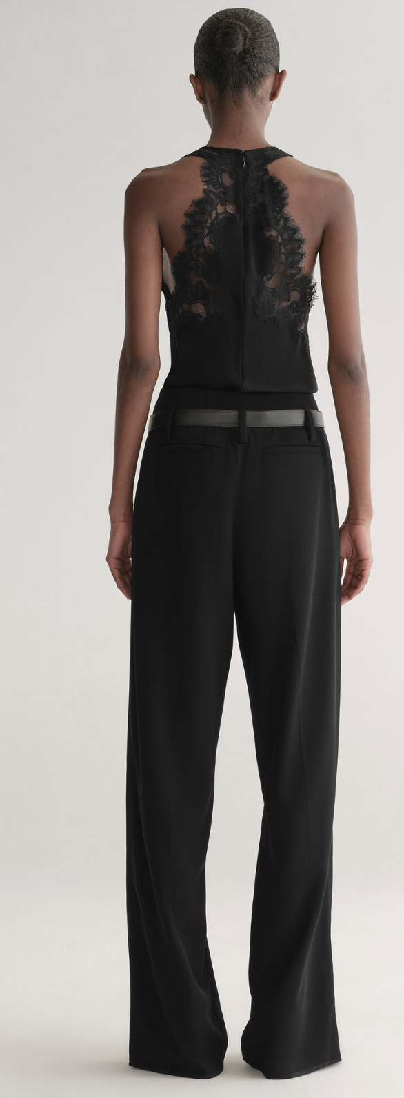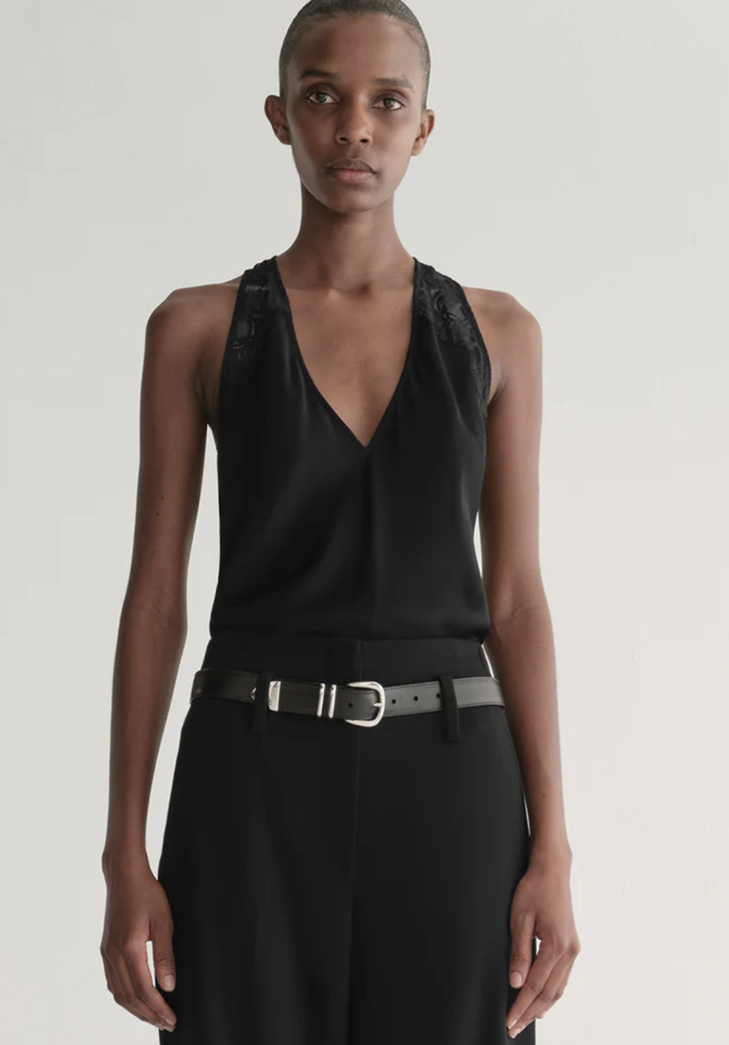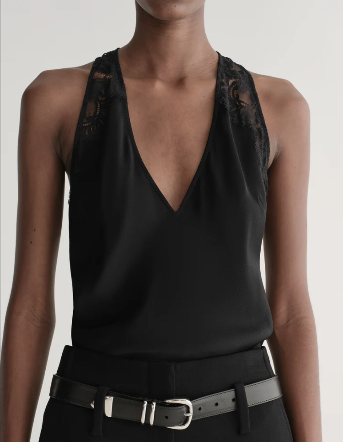 The Wes Top is your new evening essential. An elevated take on the sleeveless blouse, it features French heritage lace panels at the shoulders that bloom into a striking lace back. Cut from crepe-back satin, the V-neck silhouette drapes beautifully for a polished, fluid look. Finished with an invisible back zipper, it’s perfect for layering under blazers or styling alone for evening events—versatile, refined, and holiday-ready.