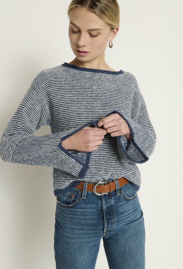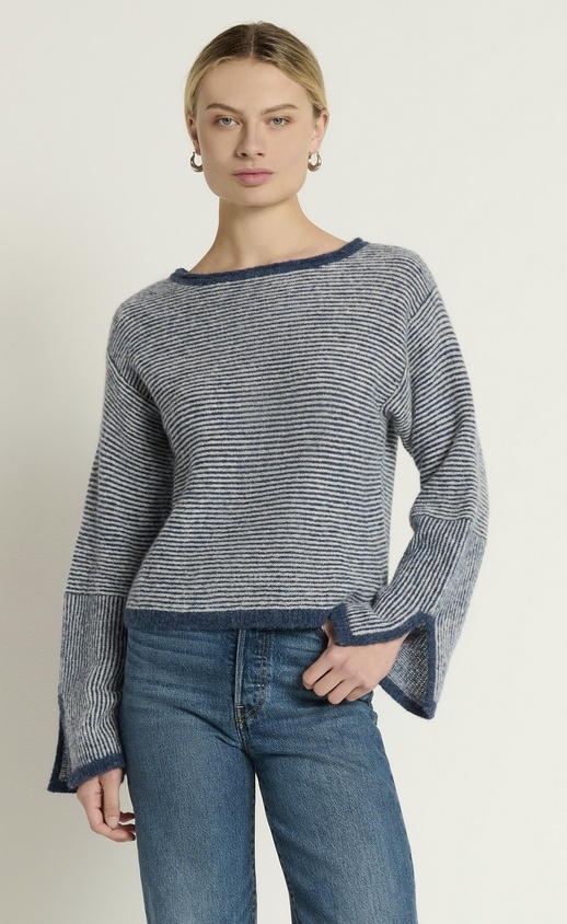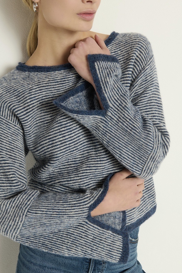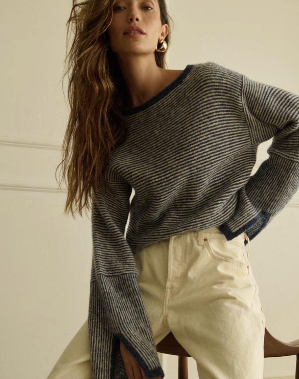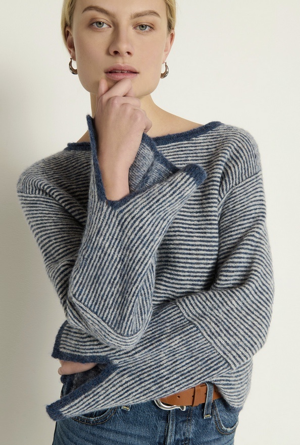 Knit from natural fibers, Willow is the layering piece of the season. Details include a relaxed, wide fit, split hems at the wrists, and a boat neck collar that looks great on its own or with a tee underneath. This one comes in Greenwich Navy Stripe.